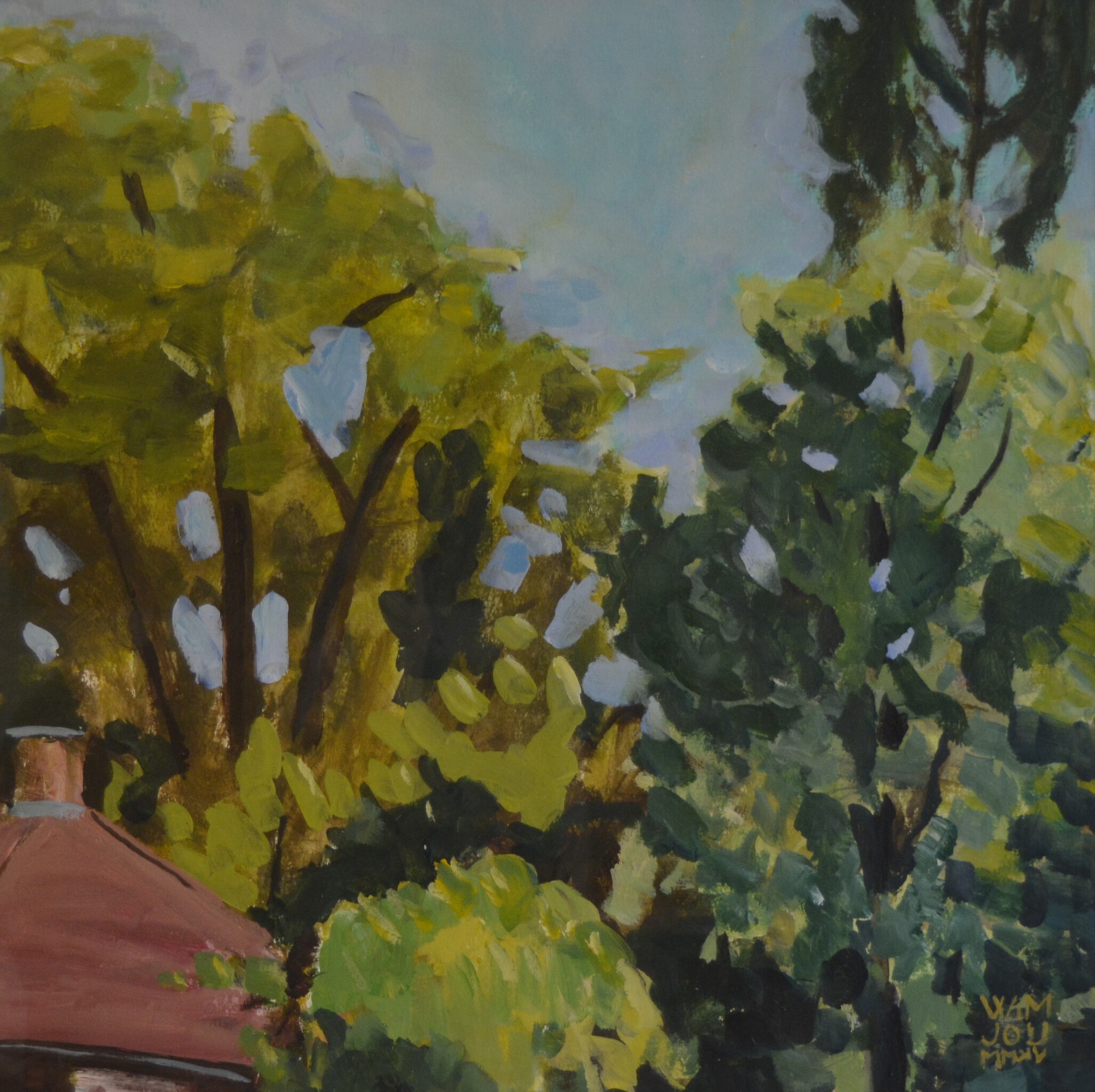 Samen met enkele andere kunstenaars heerlijk zitten schilderen in de tuin van het Singer Museum in Laren. Voor de grote verbouwing. Het werk is in 2015 gemaakt en nu in 2022 ingelijst om verkocht te worden.