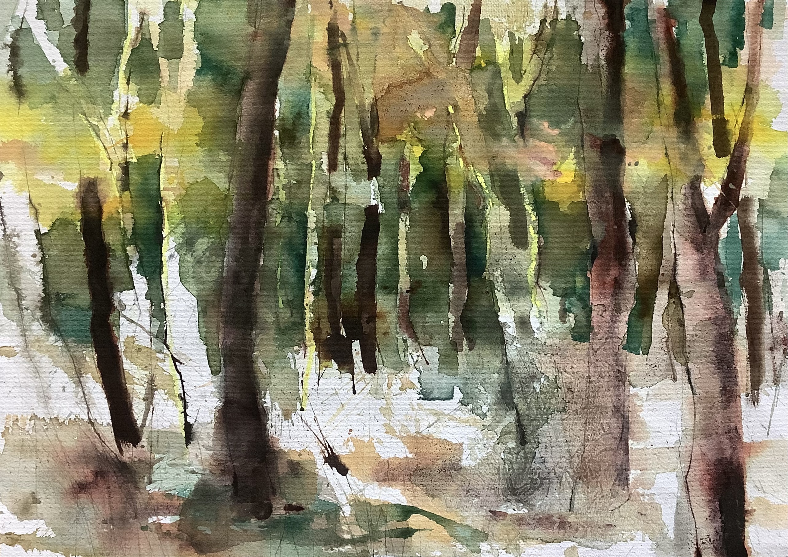 Een aquarel over een herfstbos met aardse kleuren. De aquarel wordt verstuurd in zuurvrij passe-partout. Voor een kleine meerprijs kan ik hem voor u inlijsten en bij u thuis bezorgen.