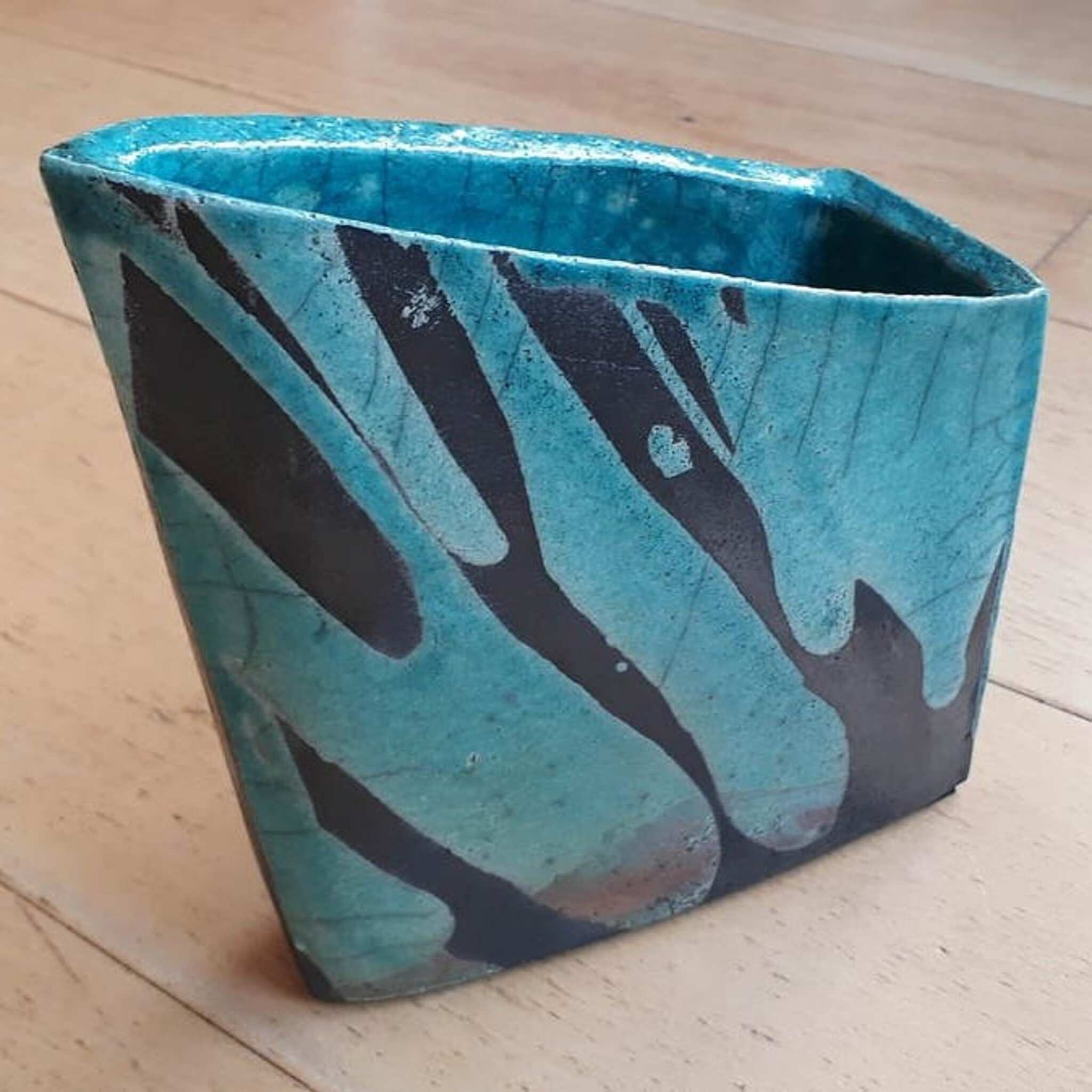 Een van de eerste raku-objecten. Boot-vaas met glazuur overgoten. Het groene glazuur heeft een koperzweem.