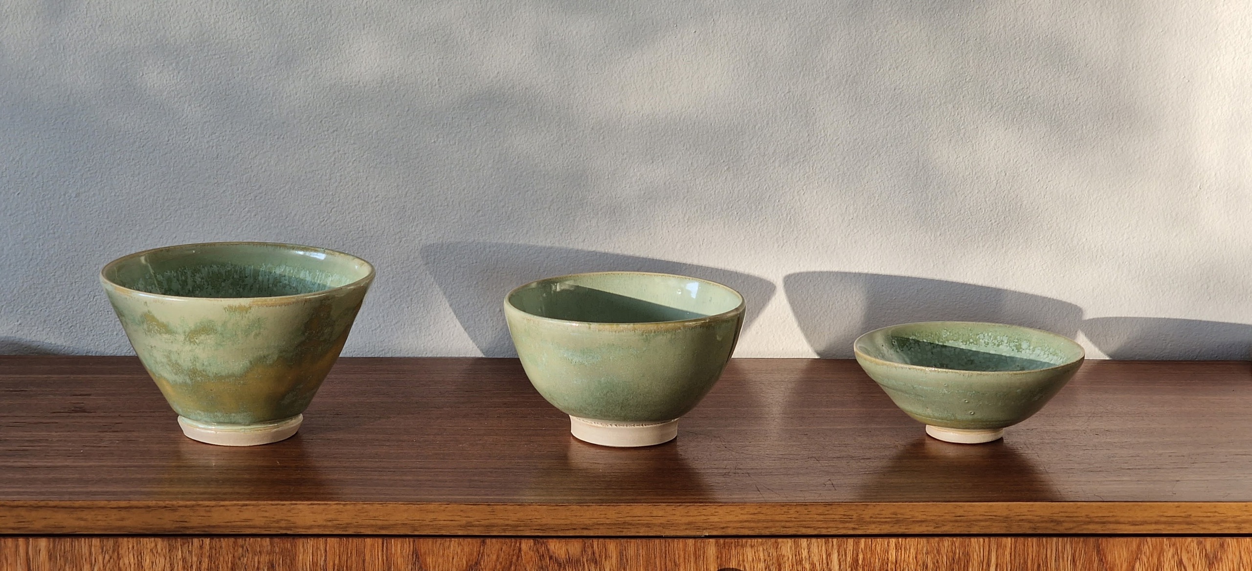 Een prachtige set schalen. Verschillende afmetingen. Kleur celeadon met blauwe accenten.