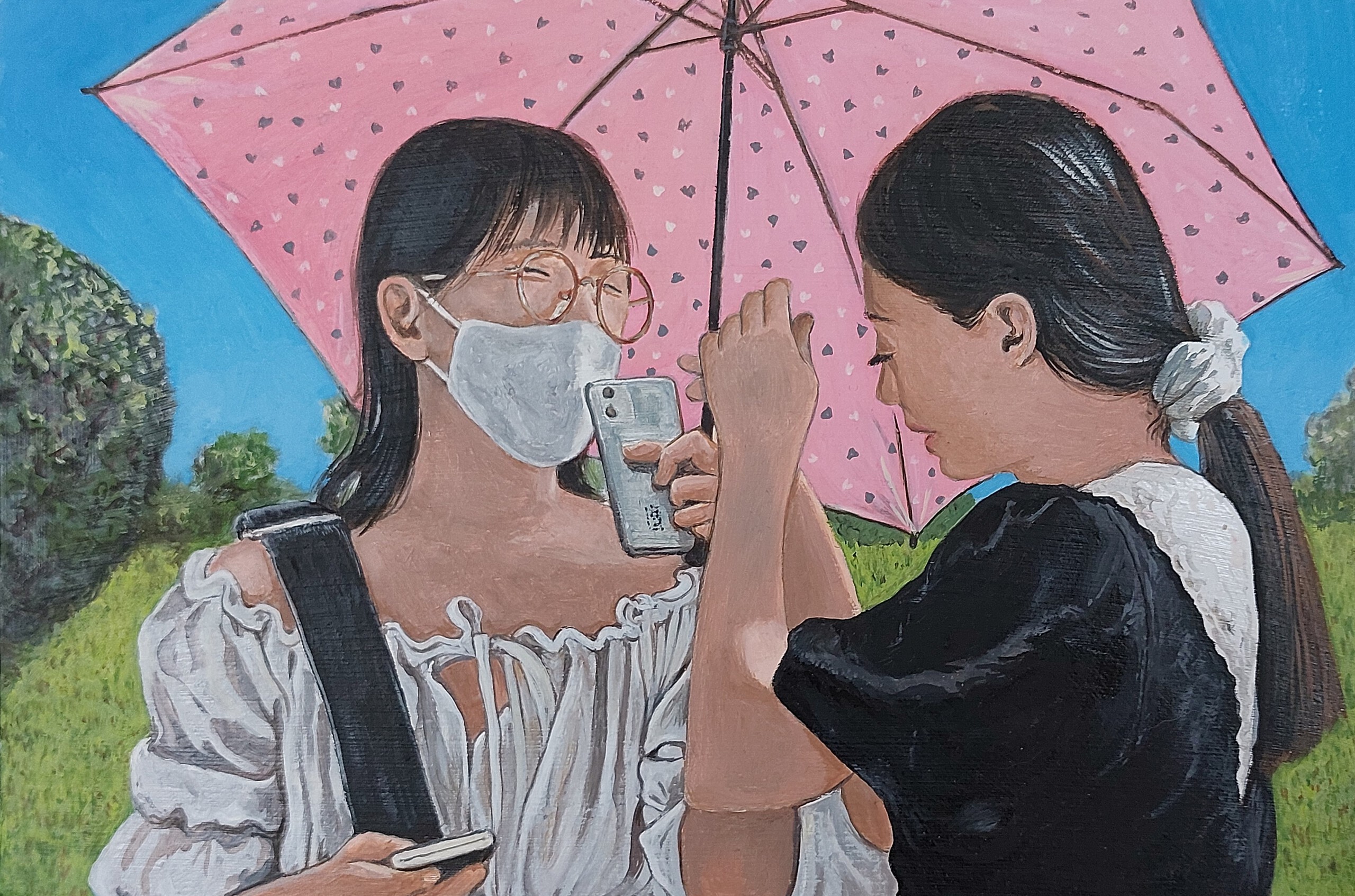 Twee jonge Japanse toeristen in Wenen spelen een elegant spel met parasol, mobiele telefoon en mondkapje. Waar hebben ze plezier om?