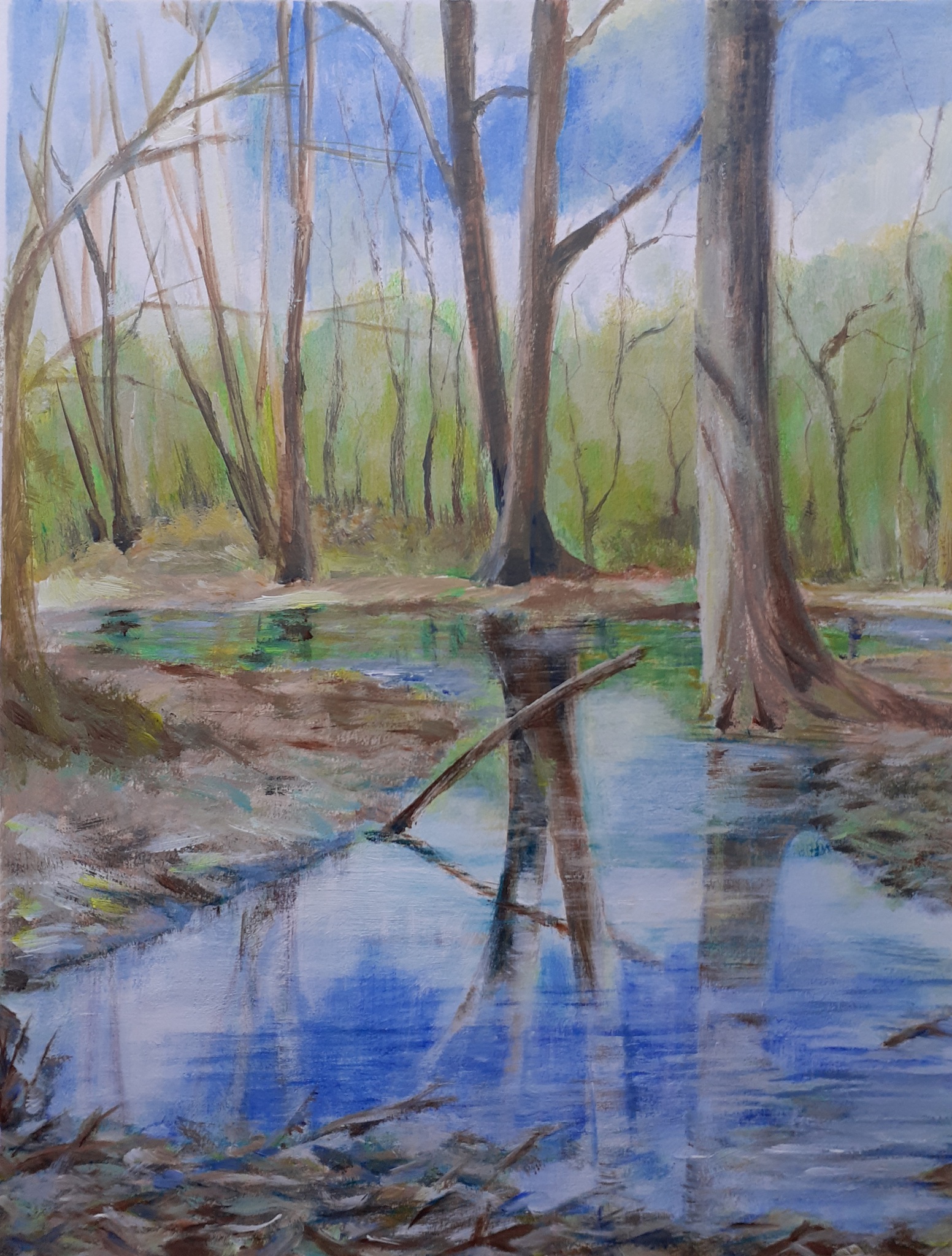 Realistisch landschap, gemaakt met acrylverf. De Leemputten is een natuurgebied bij Wouwse Plantage dat zeer nat is ; leemgrond. Daardoor krijg je een mooie afwisseling van spiegelingen in het water en bovengrond
