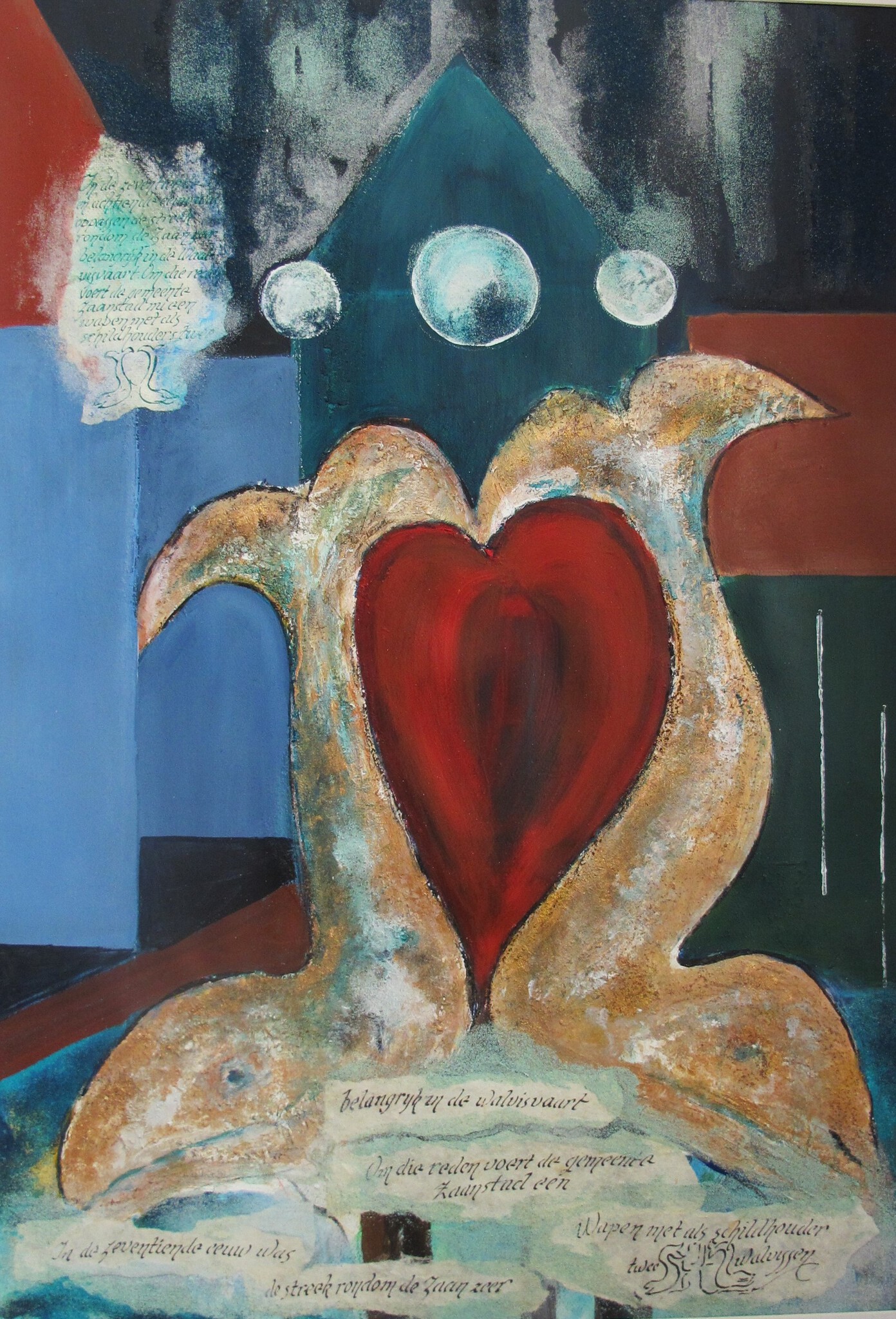 Gestileerd wapen van Zaanstad. op het stadhuis. De walvisvaart is onlosmakelijk met de Zaanse industrie.verbonden. Geschilderd op zuurvrij papier met acrylverf, zand en kalligrafie in zwarte houten lijat met passepartout. Met bijbehorende gekalligrafeerde beschrijving.