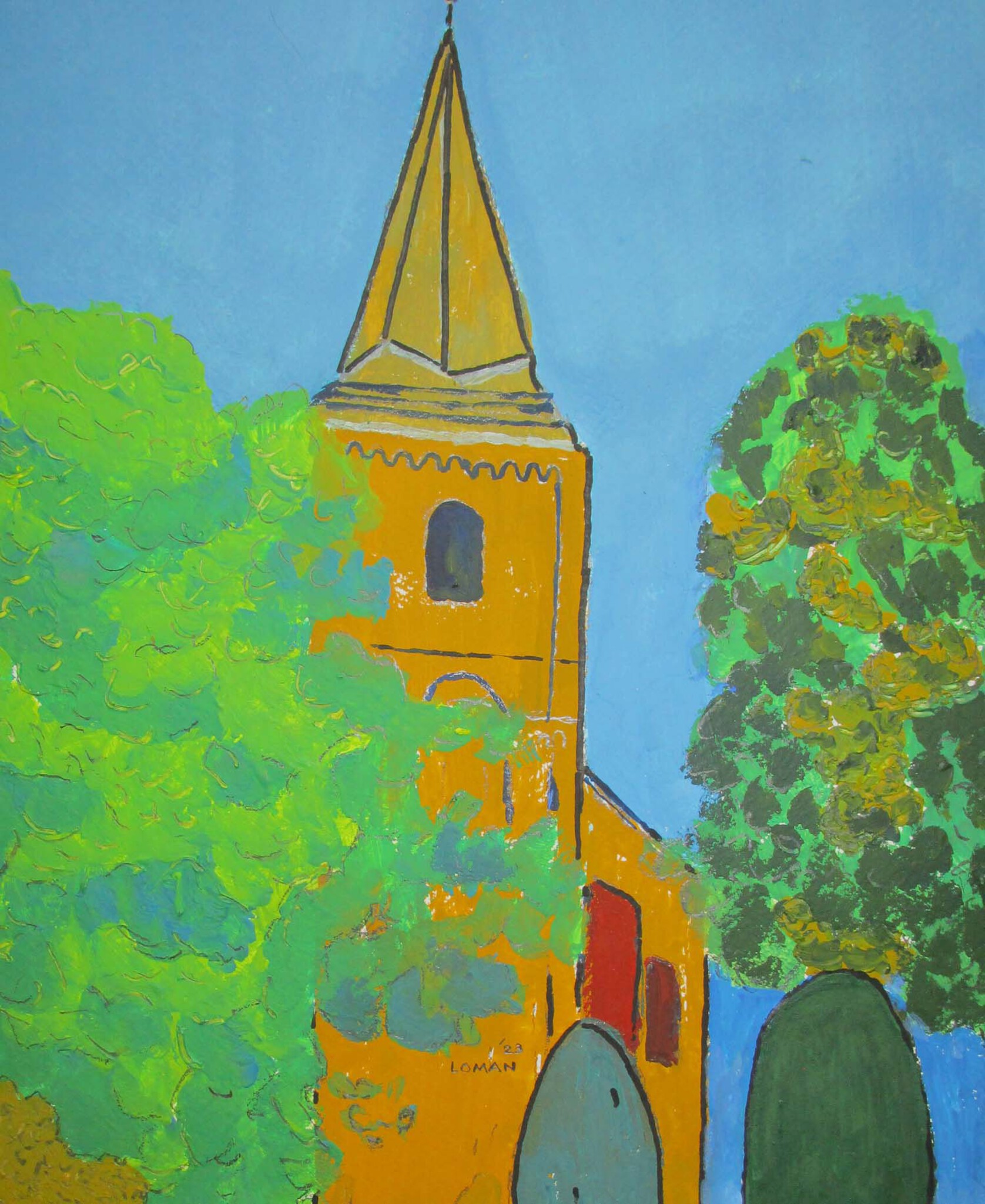 Rood Blauw Groen Bomen Lucht Kerk Kruis Okergeel Struiken Galmgat