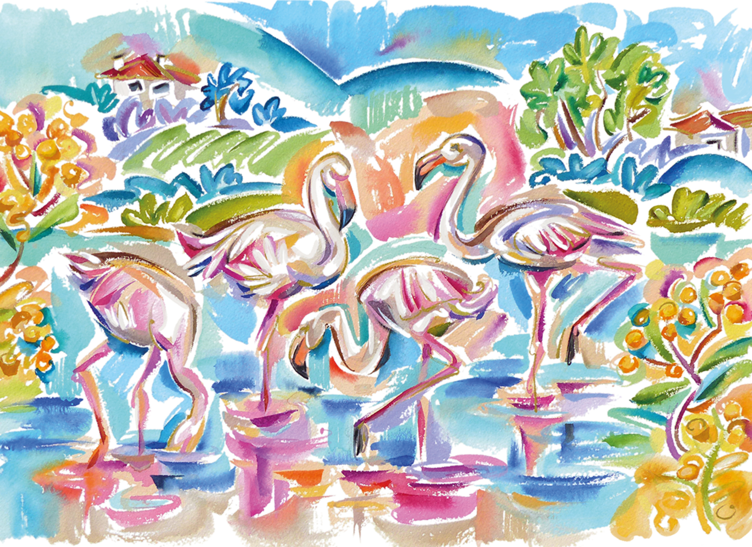 Happy Watercolor of flamingos in Ria Formosa, Faro.