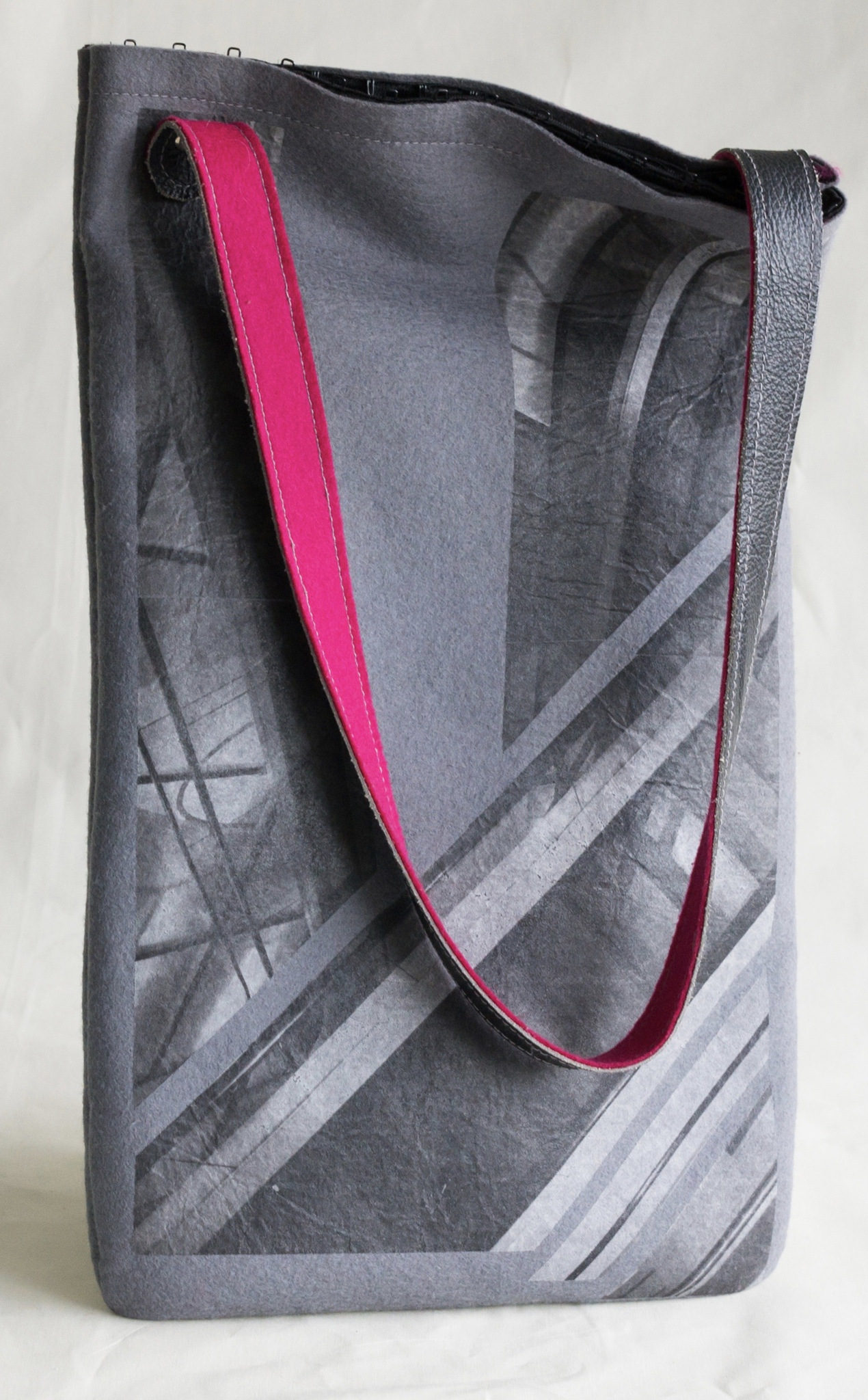 "Roltrap" tas met schouder band van industriëel vilt en leer met bh-sluiting. Deze tas is dmv foto transferdruk bedrukt met een afbeelding van "de Bijenkorf" roltrap
