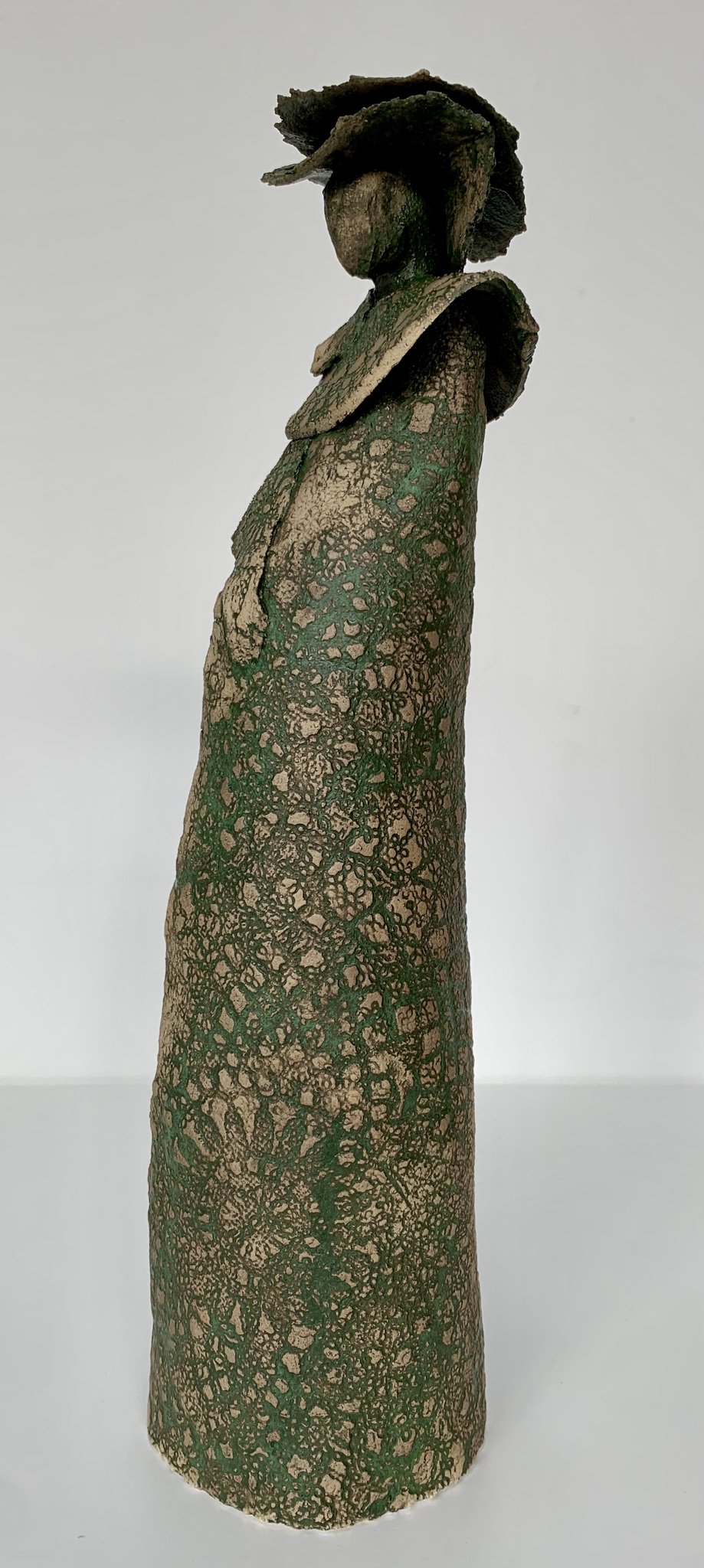 vrouwenfiguur met mosgroen met glazuur en pigment ingekleurd kanten patroon