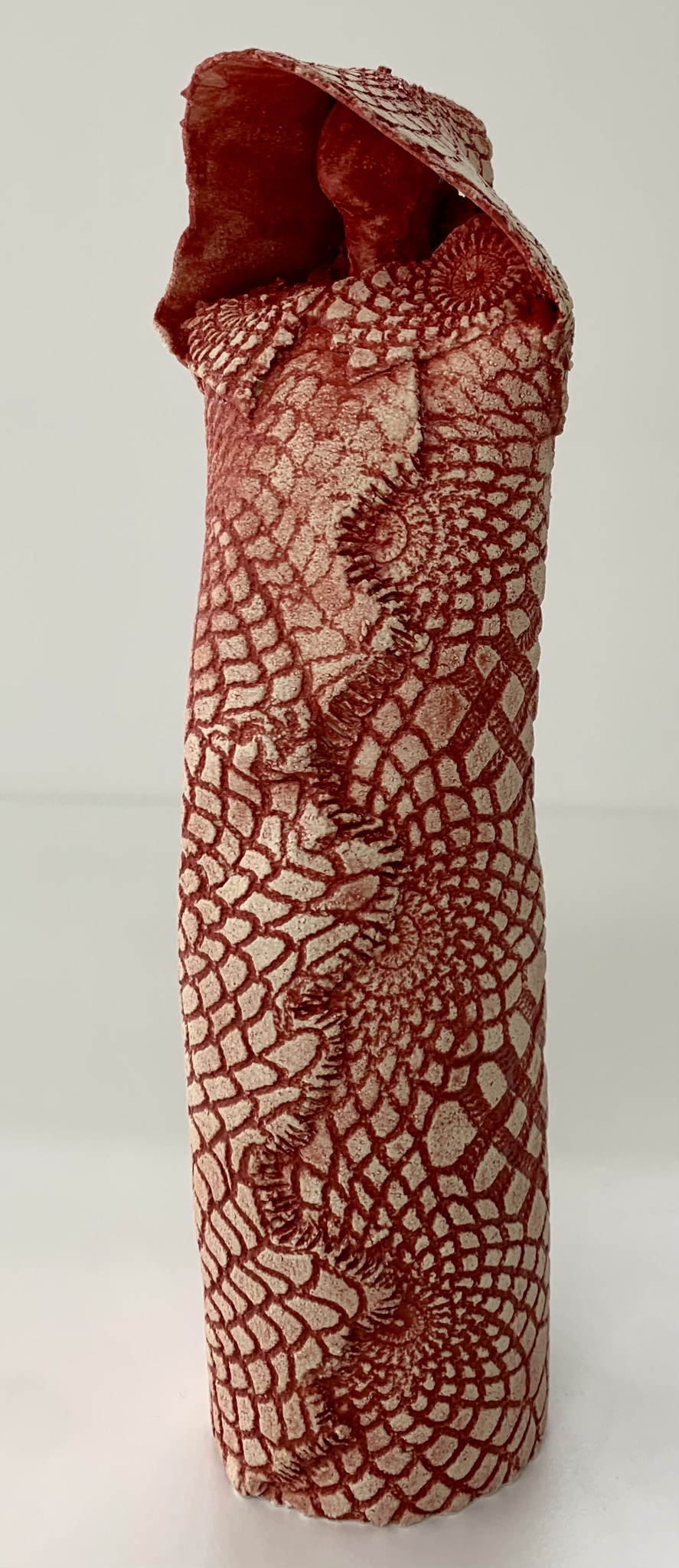 vrouwenfiguur met rood glazuur en pigment ingekleurd kanten patroon