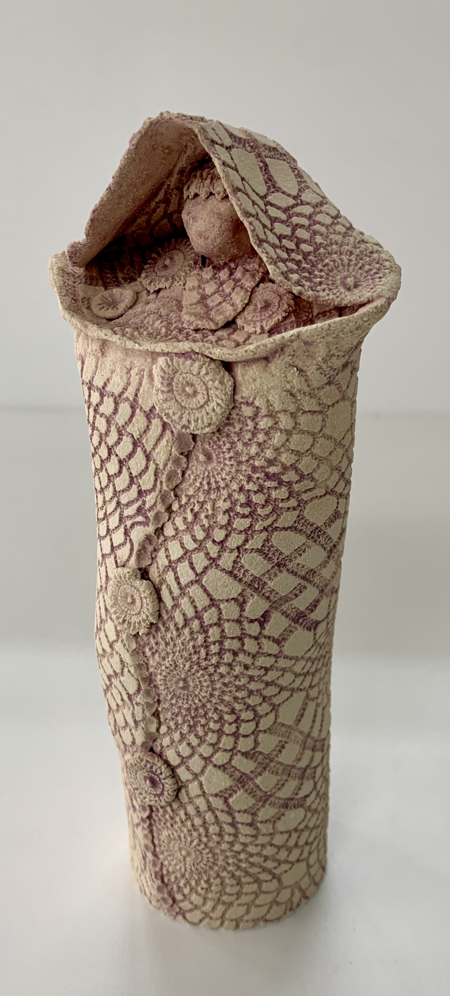 vrouwenfiguur met lila glazuur en pigment ingekleurd kanten patroon