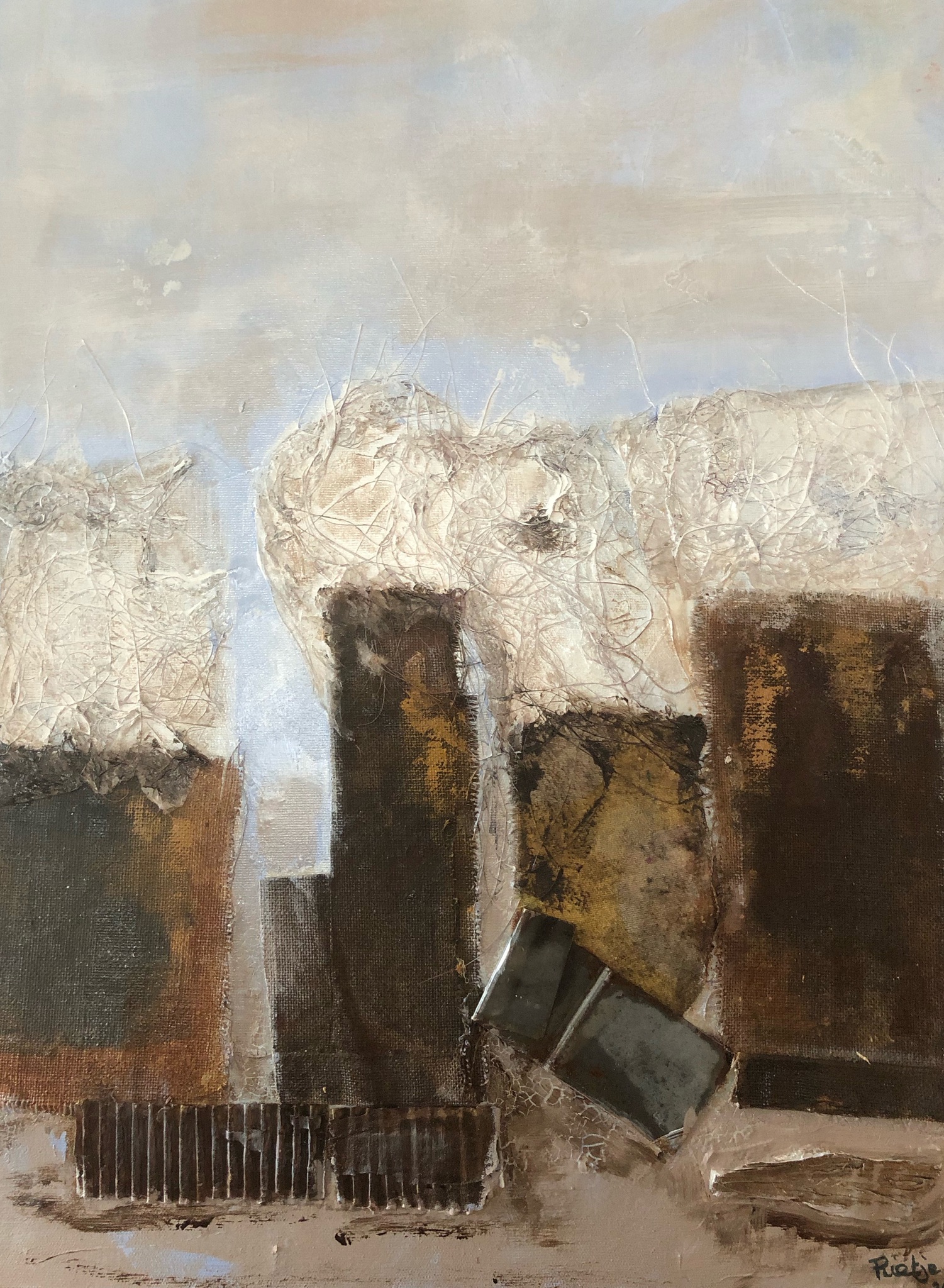 Mixed media op 50×70 cm doek. Gebruik gemaakt van textiel, karton, geschept papier, draden, hout en lood. Afwerkt met vernislaag en in een handgemaakte baklijst. Uit de serie Zeeuwse Kust,