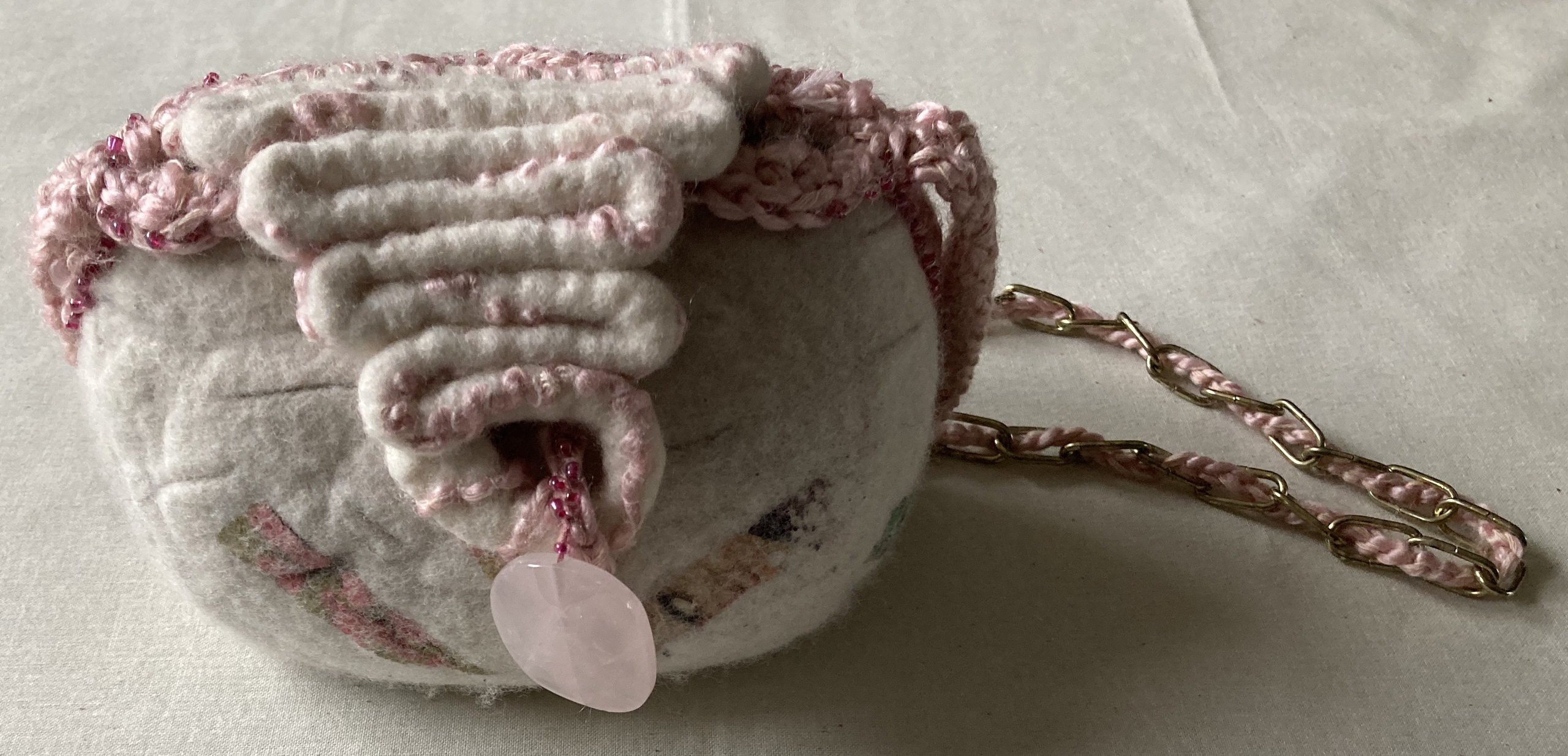 Tasje van Handgevilte wol met transferdruk en een metalen schouder ketting. Sluiting met natuursteen, roszenkwarts
