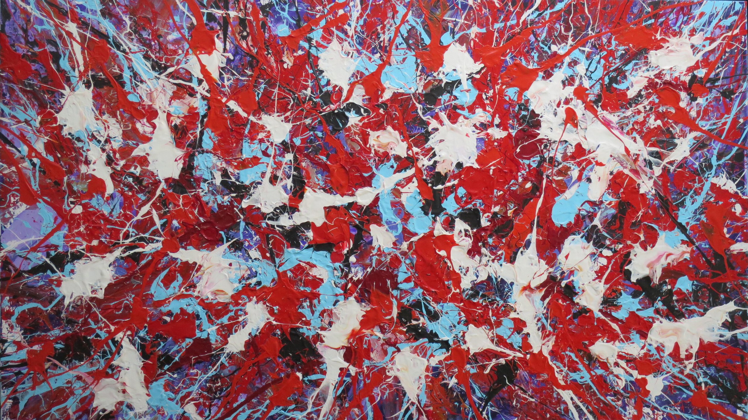 Geïnspireerd door Jackson Pollock en Sam Francis. Heeft geen specifieke boven of onderkant. Kan horizontaal, verticaal etc opgehangen worden. Aluminium frame- Linnen doek van goede kwaliteit