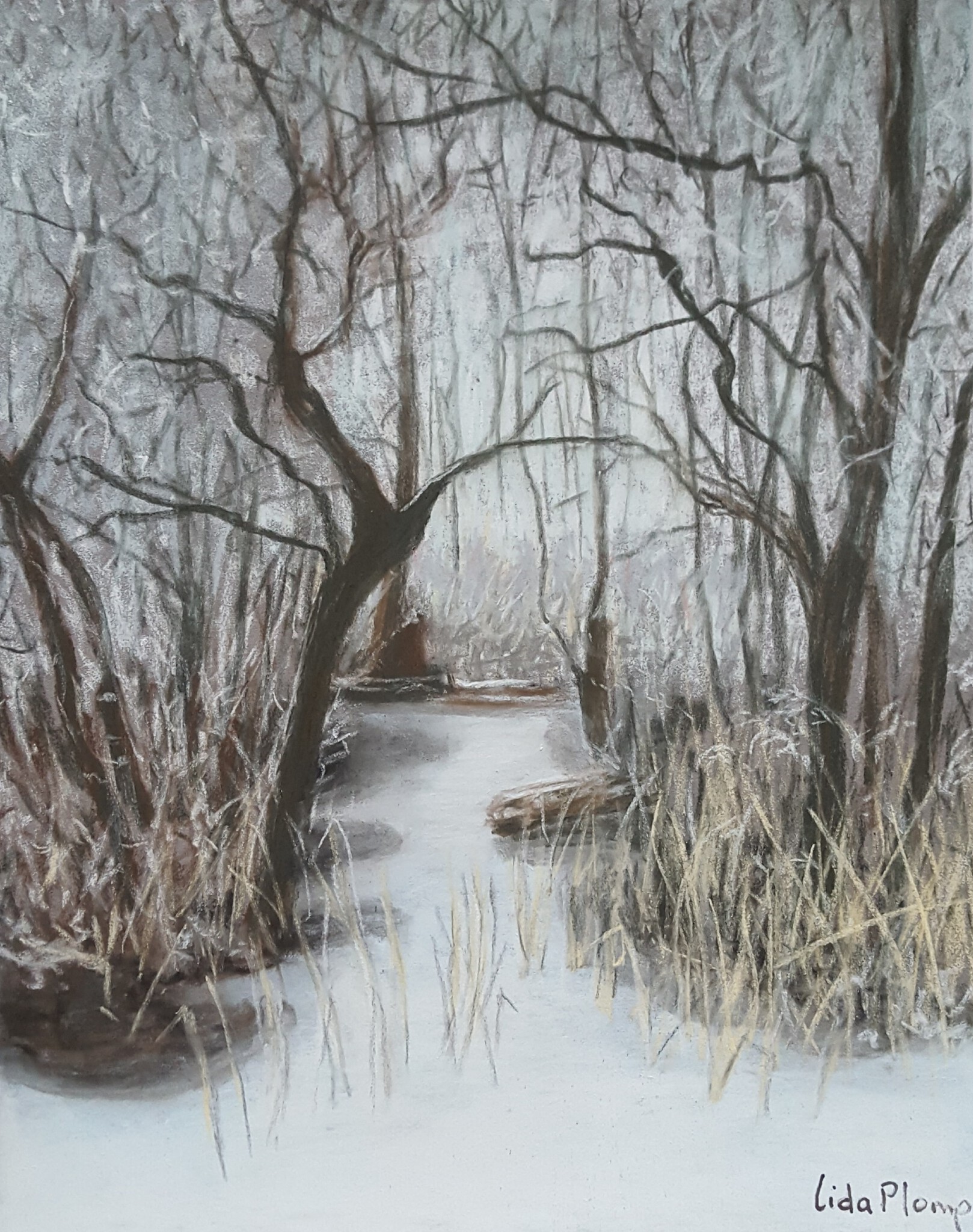 Winter. Pastel in whitewash houten lijst met passepartout. afmeting 40x50 cm