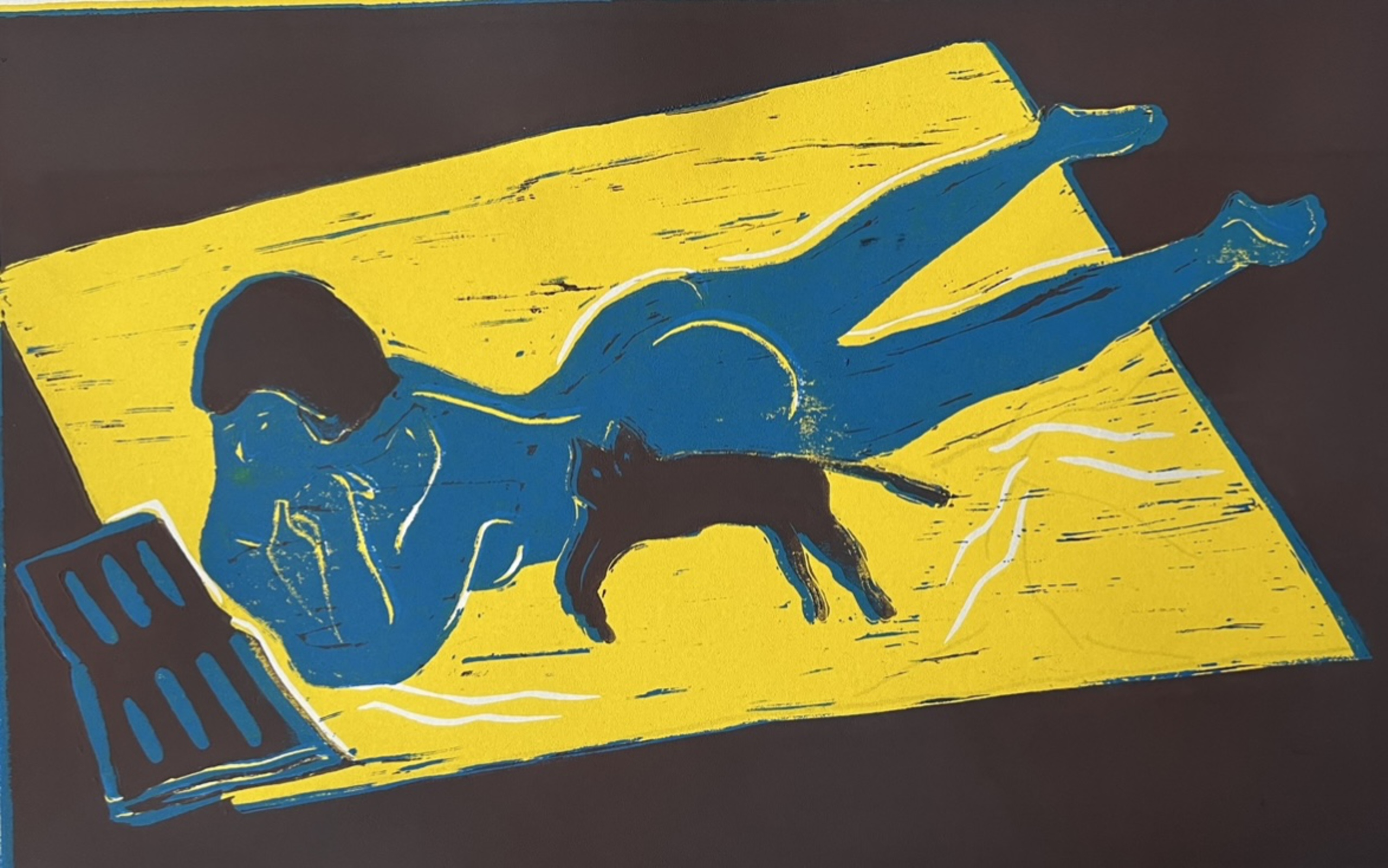 Linoleumprint op papier. Gemaakt dvm reductie methode waarbij je je linoleum steeds wegsnijd alvorens de volgende kleur aan te brengen. Deze voorstelling heb ik verschillende kleuren combinaties gemaakt. Deze blauwe dame ligt met paarse kat op haar gele doek.