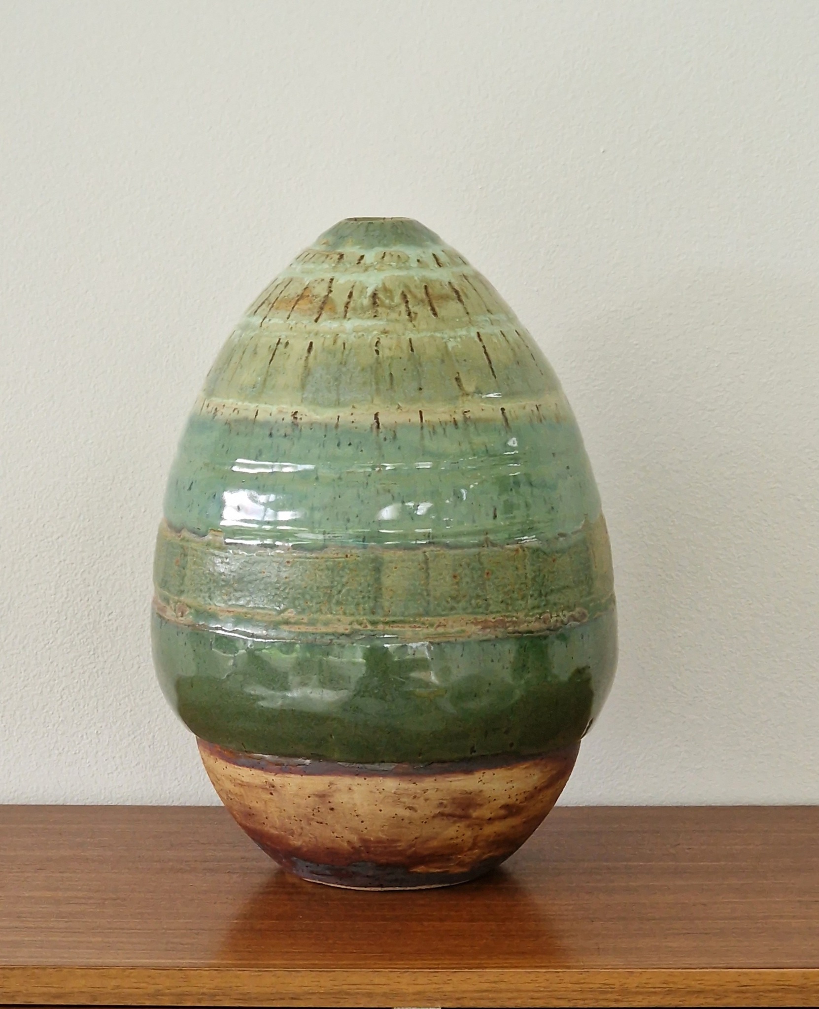 OAK Dat is de naam van deze handgevormde vaas (hoogte 34 cm, diameter 24 cm). Glazuren en oxides. En steengoed klei. Verkocht.
