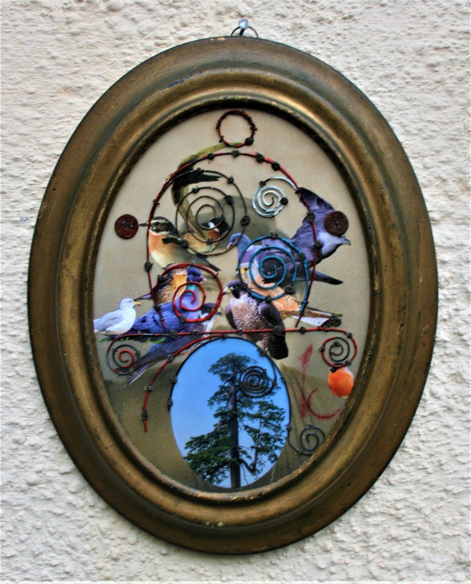 Antieke foto in originele lijst, bewerkt, ijzerdraad, acryl, collage
