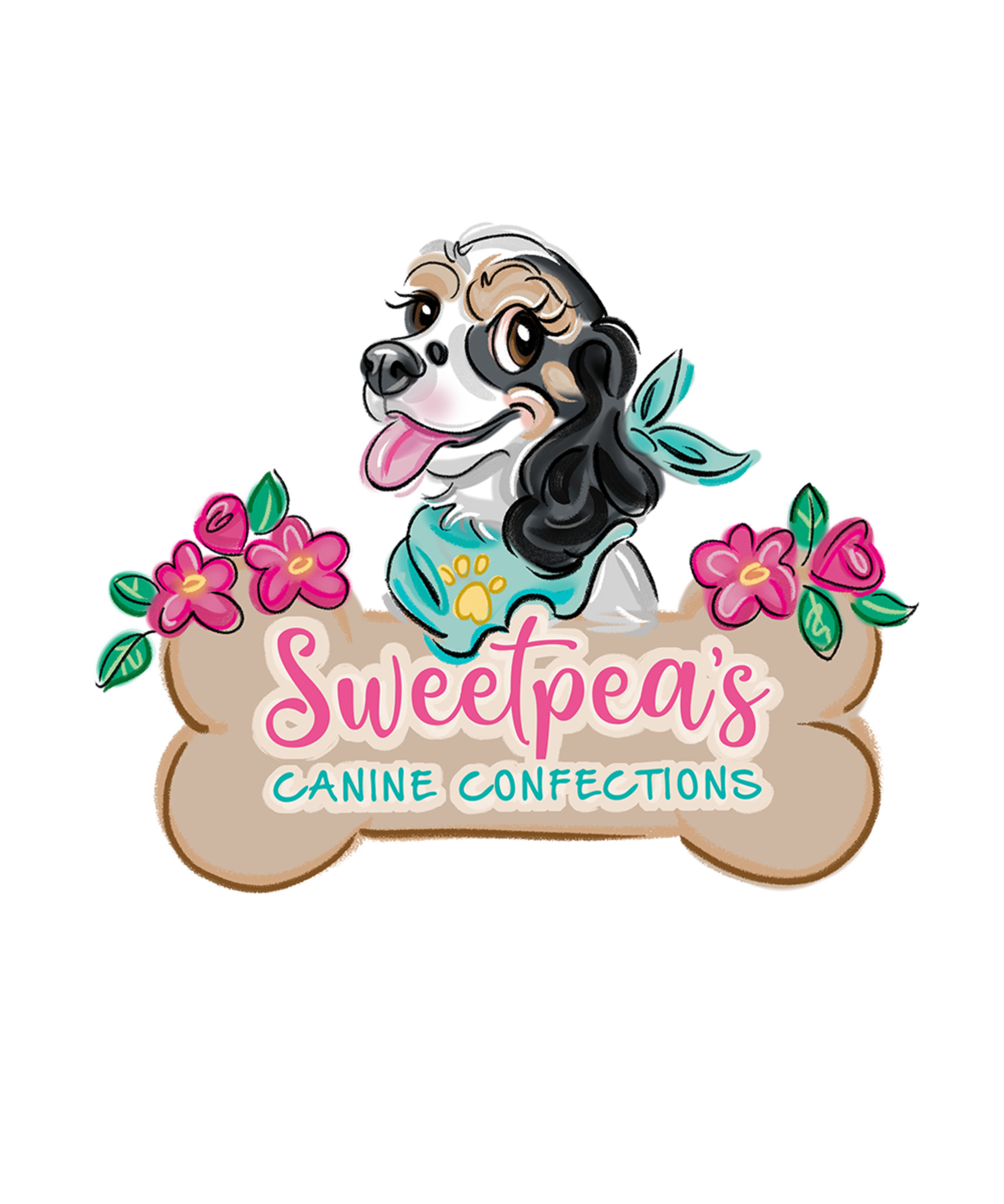 Logo design for Sweetpea's Canine Confections, USA. Homebaked delicious dog treats. With Zoey as the model for the logo.