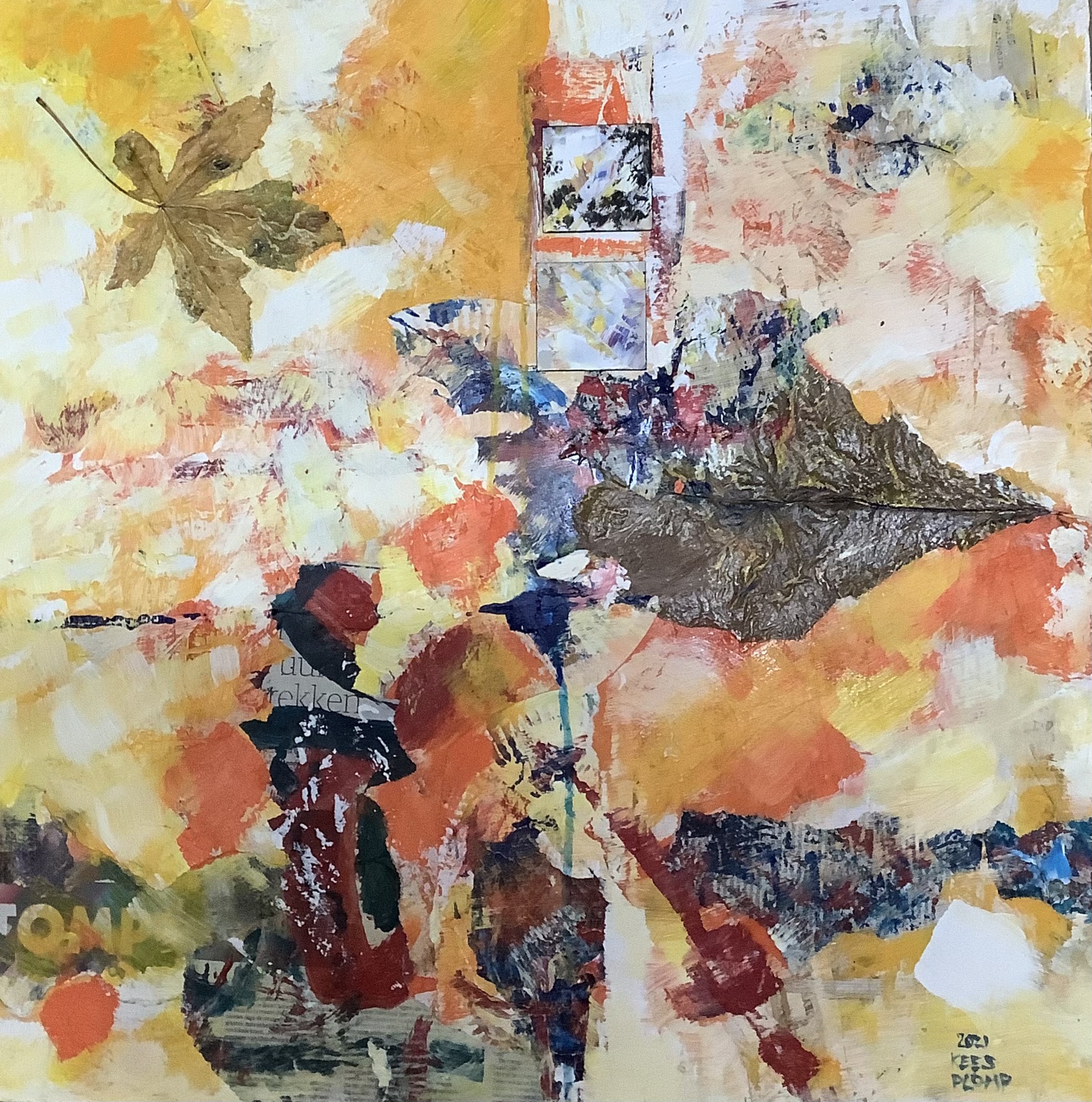 Abstract werk, bestaande uit 4 delen , elk 60x60 cm. Acrylverf, papier collage en bladeren op vezelplaat