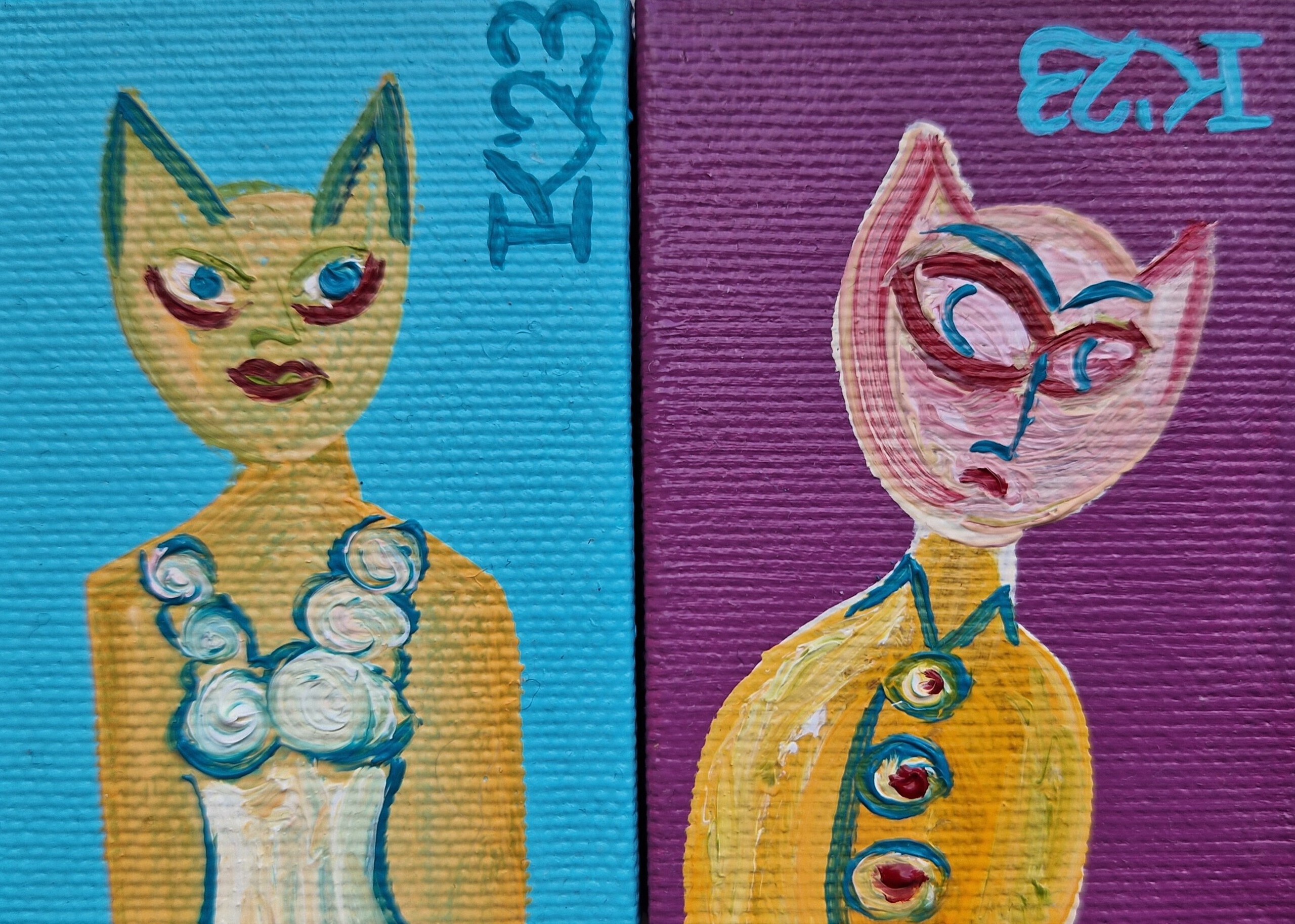 Twee minischilderijtjes, 7 bij 5 cm, olieverf op katoen, met ophanghaakjes, Pictoright 2023. Twintig euro per stuk. De prijs is exclusief verzendkosten.