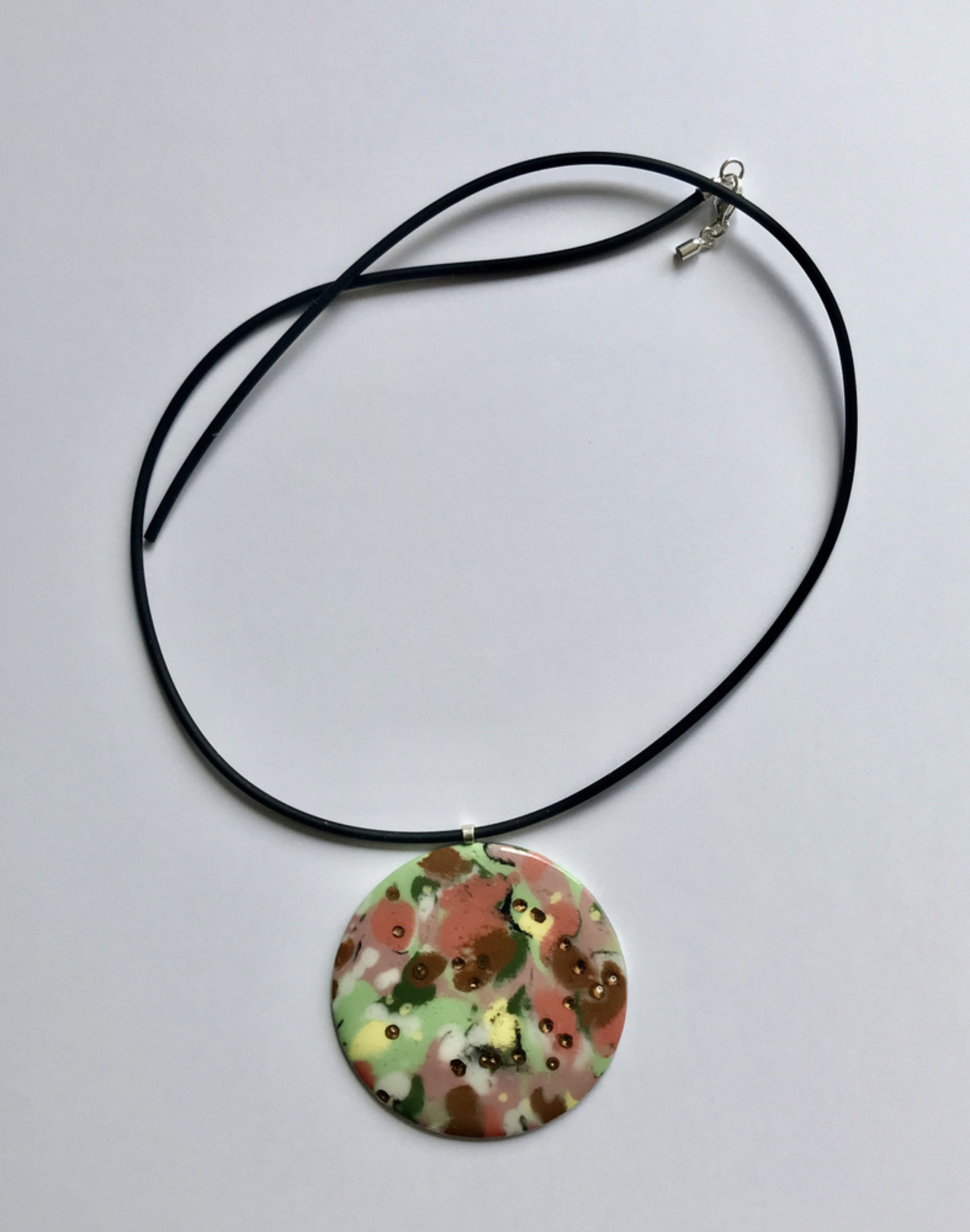 Necklace van porselein met inlays van stains en tipjes van goudluster / 3x gebakken. Slotje, eindstukjes en ophanging zijn van zilver.