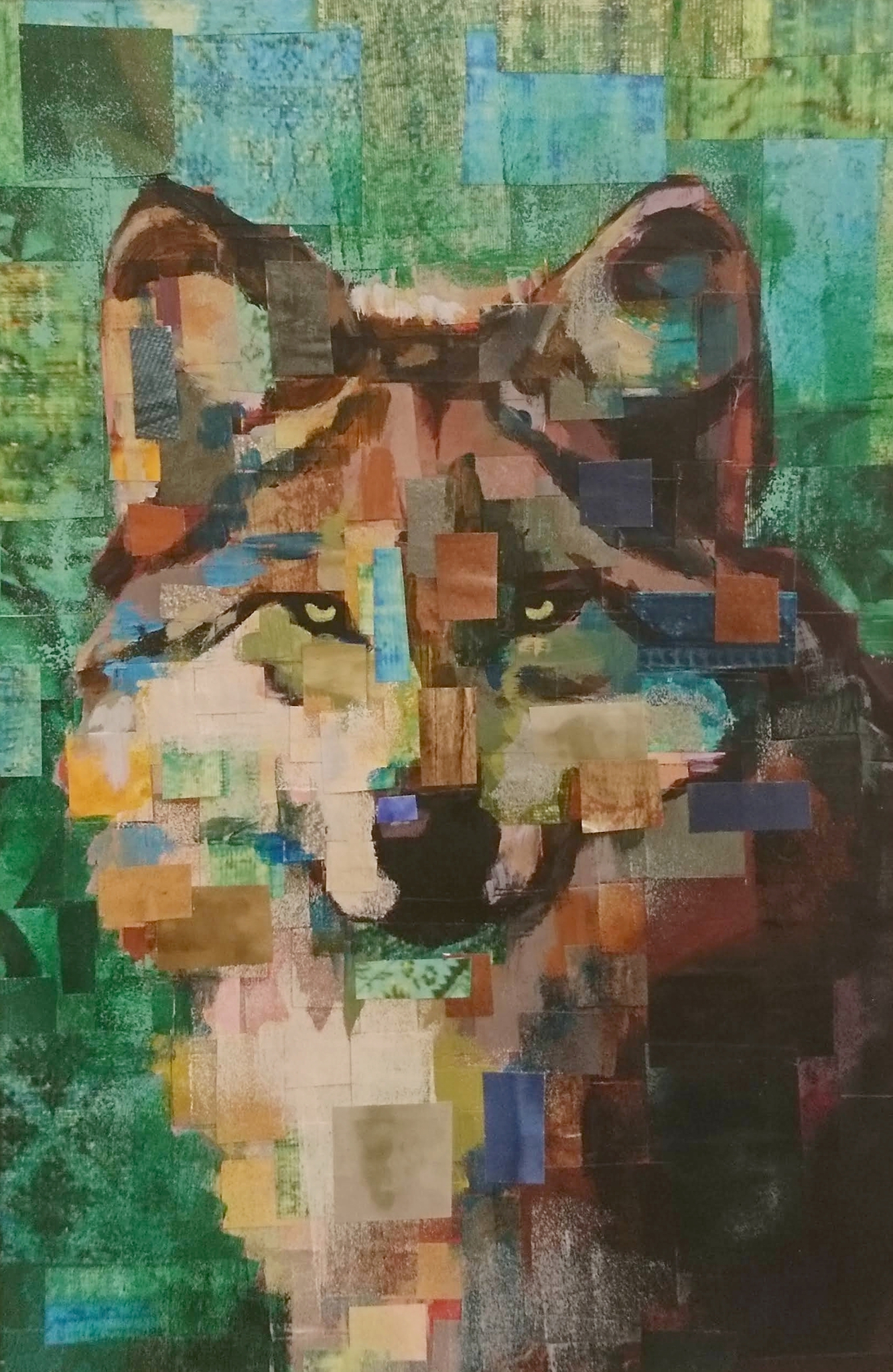 Wolf gemaakt met stukje tijdschriftpapier en acrylverf op papier