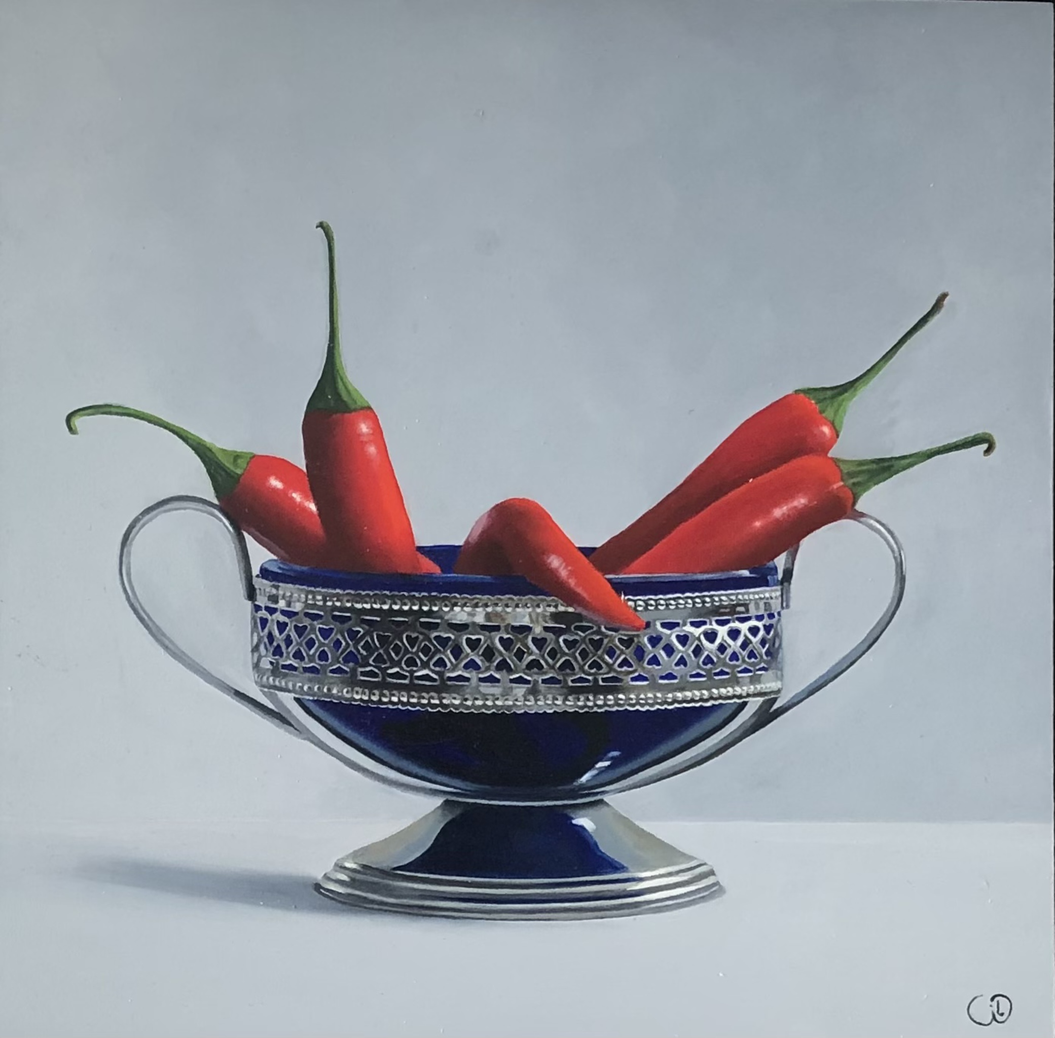 Blauw glazen engelse suikerpot met zilverkleurige rand en rode pepers.