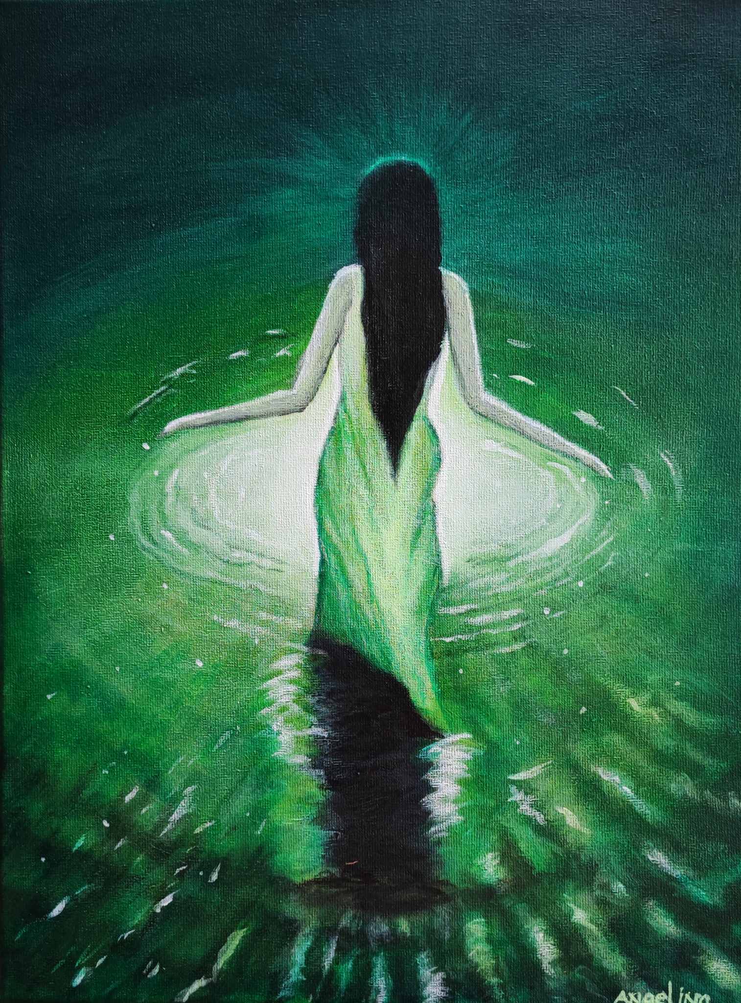Dit werk doet denken aan de Lady of the Lake, maar het mag ieders fantasie prikkelen. Wat is er aan de andere kant van haar? Een ander persoon? Iets in het water? Of doet zij iets magisch? Daar mag iedereen over weg dromen!