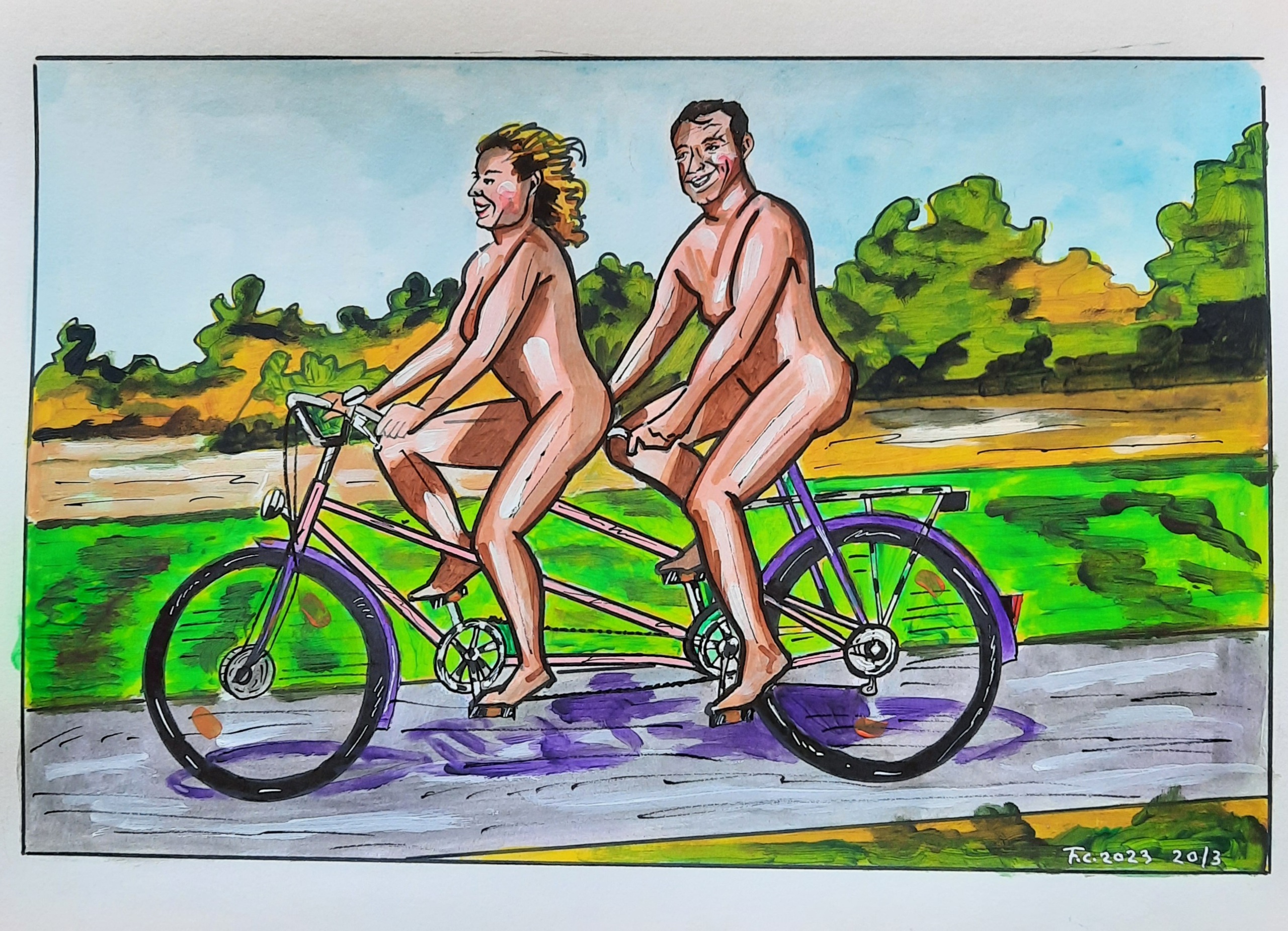 Vrouw Man Naakt Model Natuur Fiets Erotiek Tandem