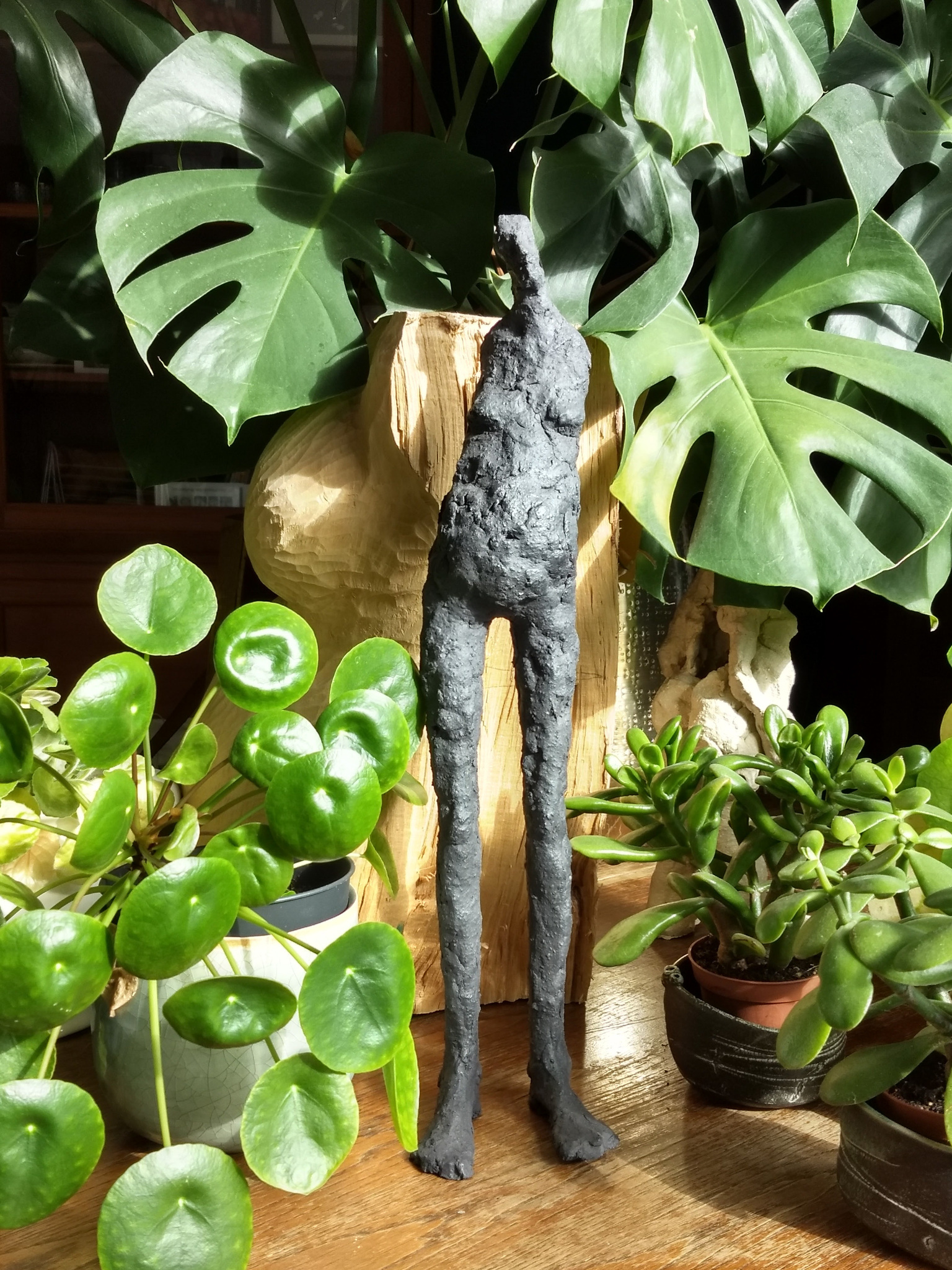 Sobere, slanke figuren, opgebouwd in grove zwart-bakkende klei.