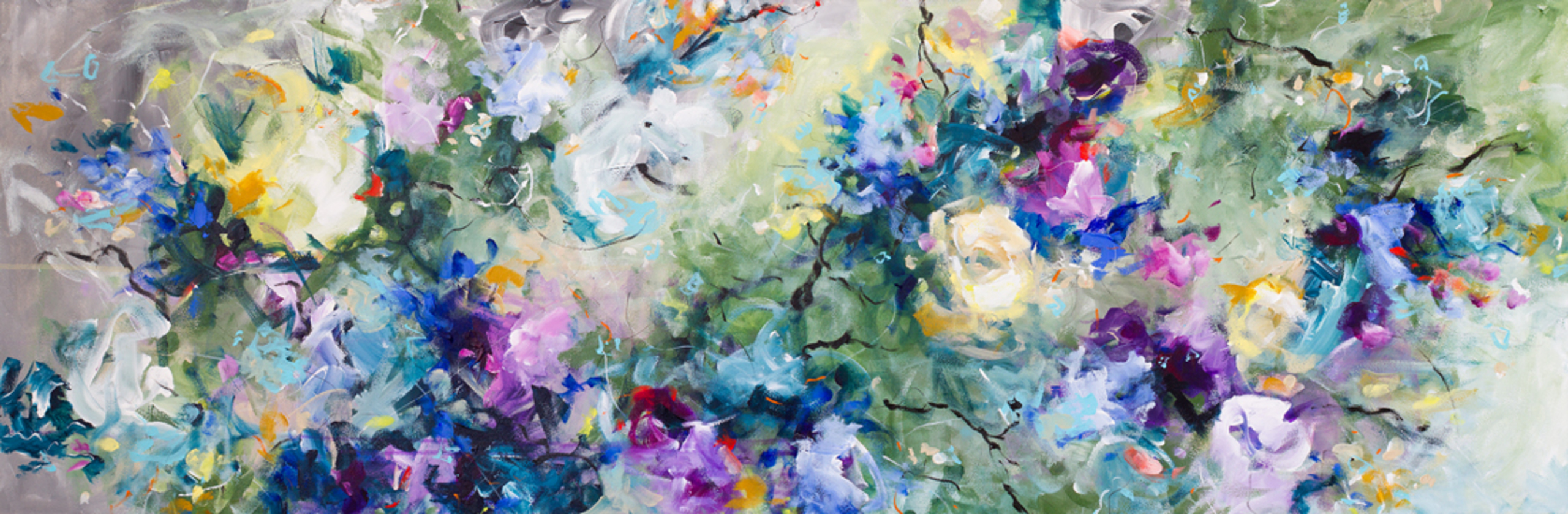 Weer een wervelend bloemachtig doek is verschenen bij het intuïtief schilderen. Dit frisse panoramabeeld heeft een zacht palet van koele kleuren met warme accenten en grillige lijnen die je oog door de compositie leiden. Energie, vrolijkheid, lucht, voorjaar. Dit werk is zowel in horizontale als verticale oriëntatie fraai, en kan door de langwerpige vorm heel goed ingezet worden om lengte of hoogte in je interieur te accentueren. De zijkanten zijn meegeschilderd. Wordt geleverd zonder lijst. Het doek kan ook zonder lijst worden gehangen. Prints zijn ook verkrijgbaar via de Qeimoy website.