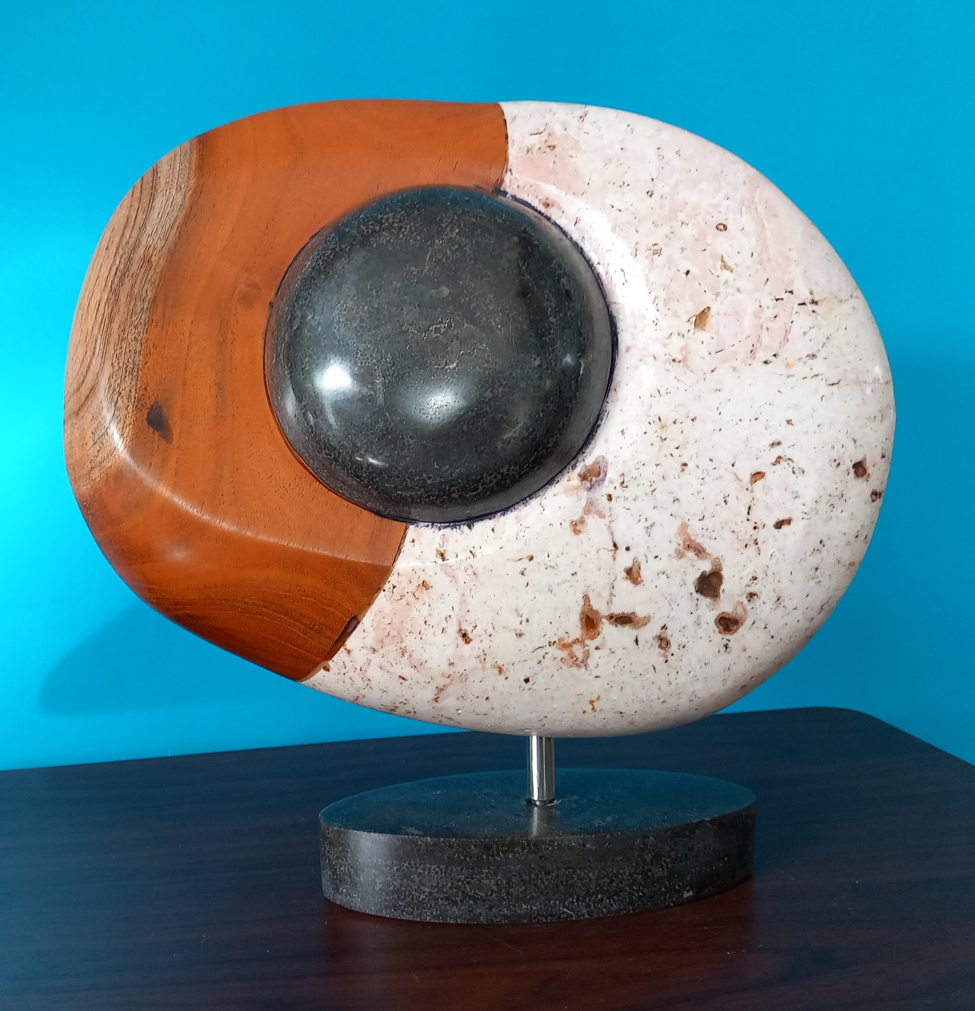 Een combinatie van kalksteen, mahonie en marmer.