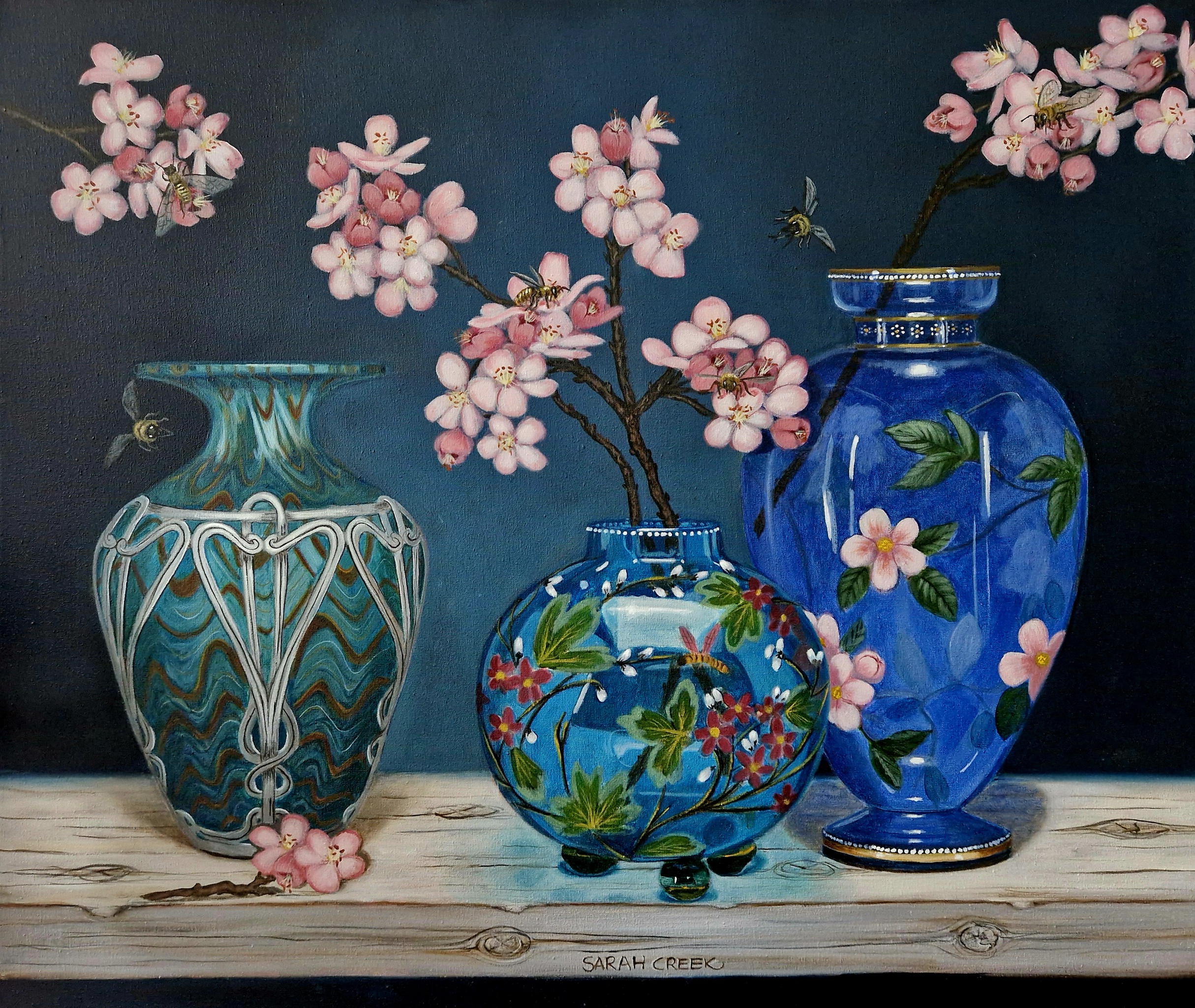 Sarah Creek schildert met acryl op canvas of linnen. Onderwerpen zijn portretten en stillevens. Sarah geeft les aan 55 talentvolle cursisten in een atelier aan huis.