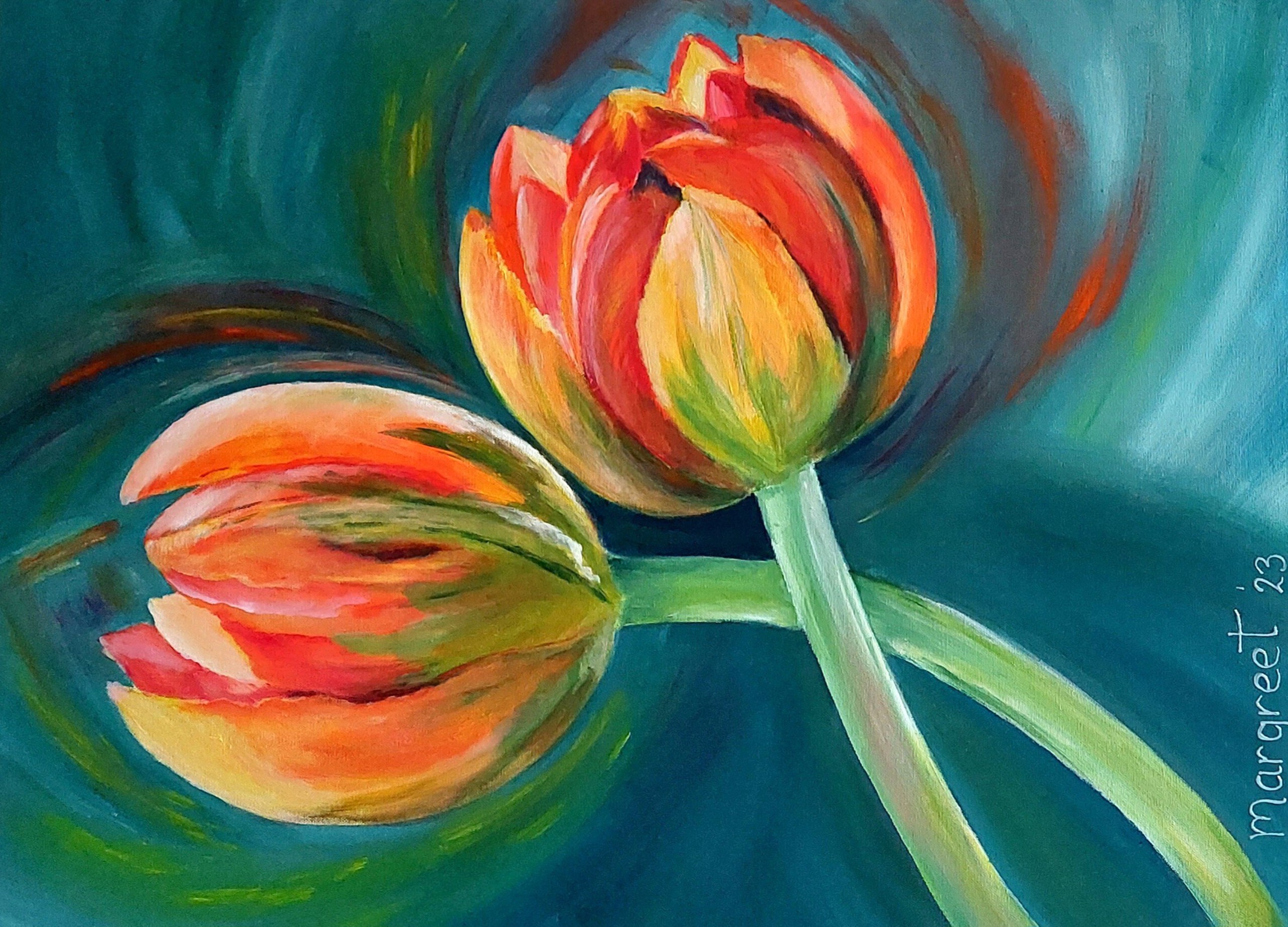 Twee krachtig kleurende tulpen. Samen vullen ze het doek. Dit werk is ook als kaart te koop en als art print te bestellen.