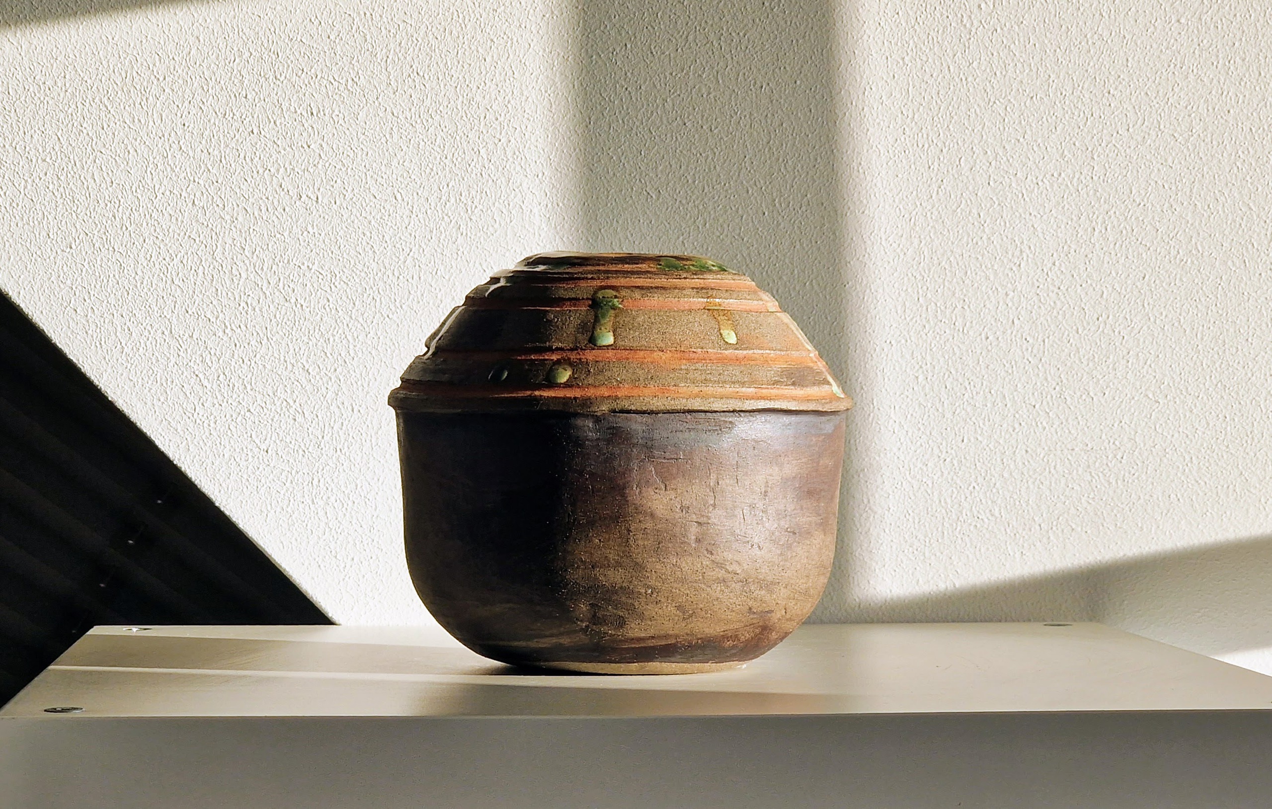 Een klein bonkje is het. Prachtig in de zon. Grijze klei, verschillende glazuren en oxides. Te gebruiken als vaas of gewoon om naar te kijken.