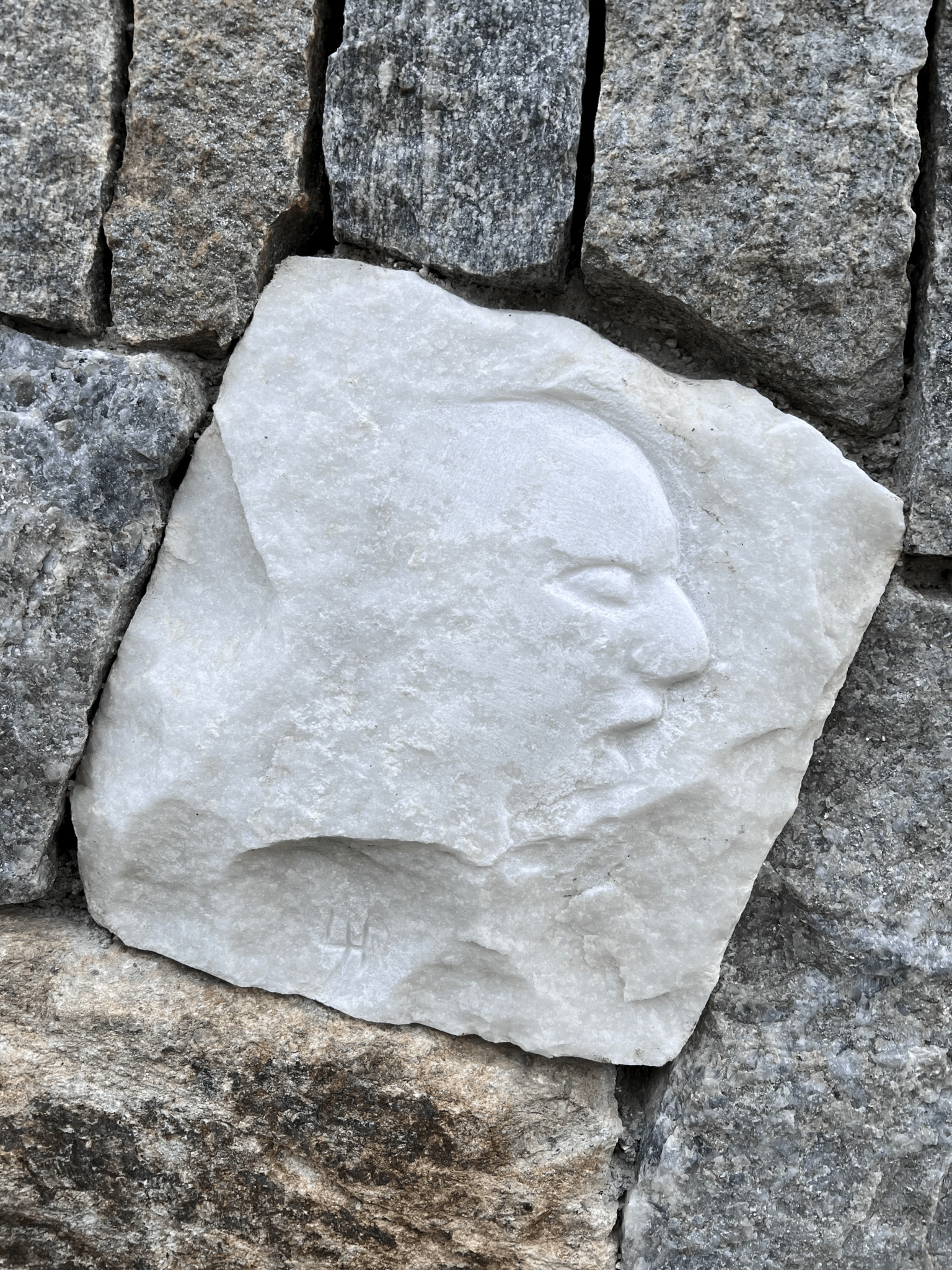 Verborgen in een muur uit natuursteen uit een blok witte Lasa marmer gehouwen silhouet.