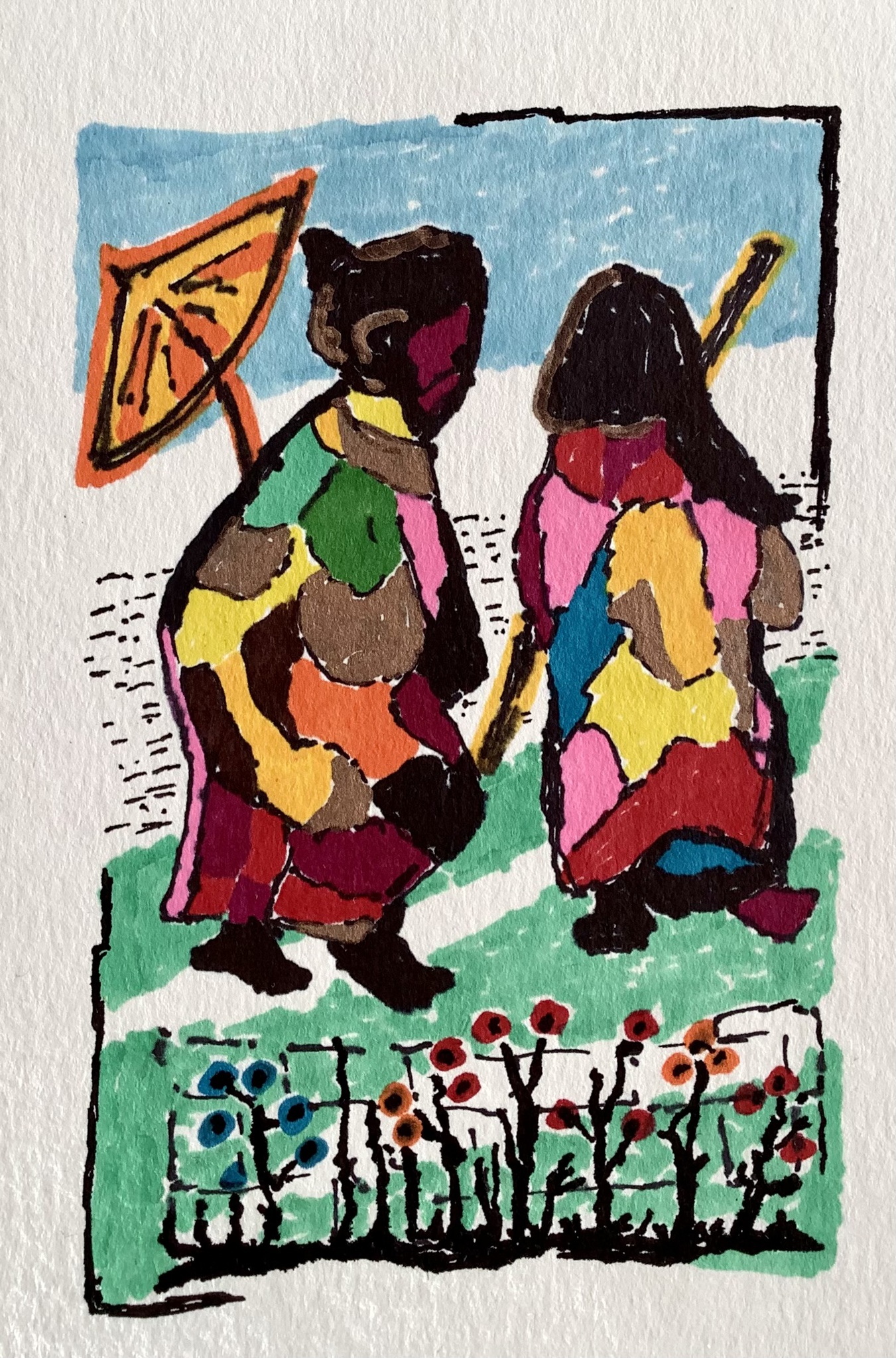 In kimono gehulde figuren. Aan het tuinieren?