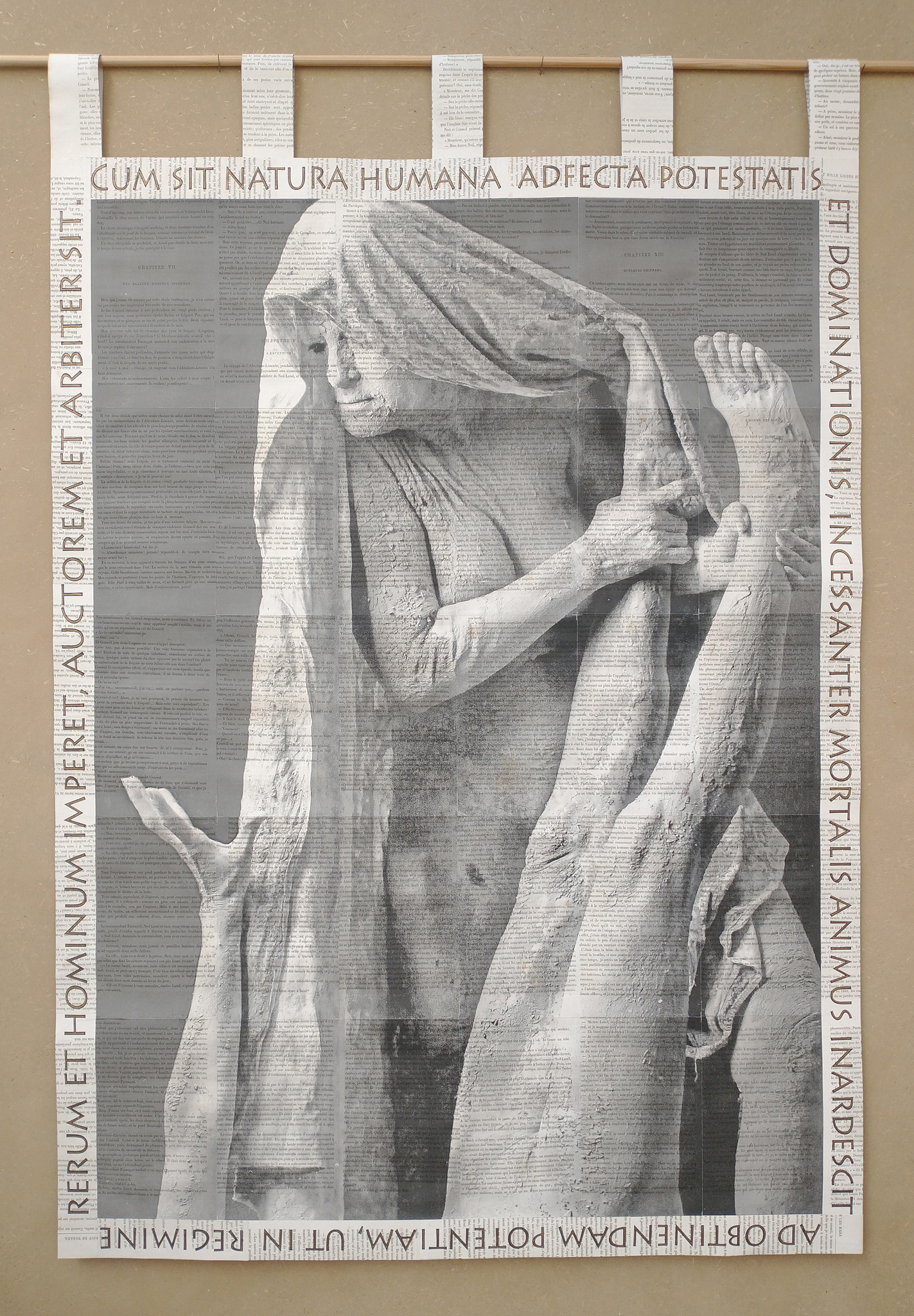 'Macht', papierbanier, één van de vele beelden uit "En uit de Aarde verscheen de Mens', geprint op papier uit oude boeken. Onderdeel van een 6-luik van 6m breed. De Latijnse tekst is gegenereerd door kunstmatige intelligentie.