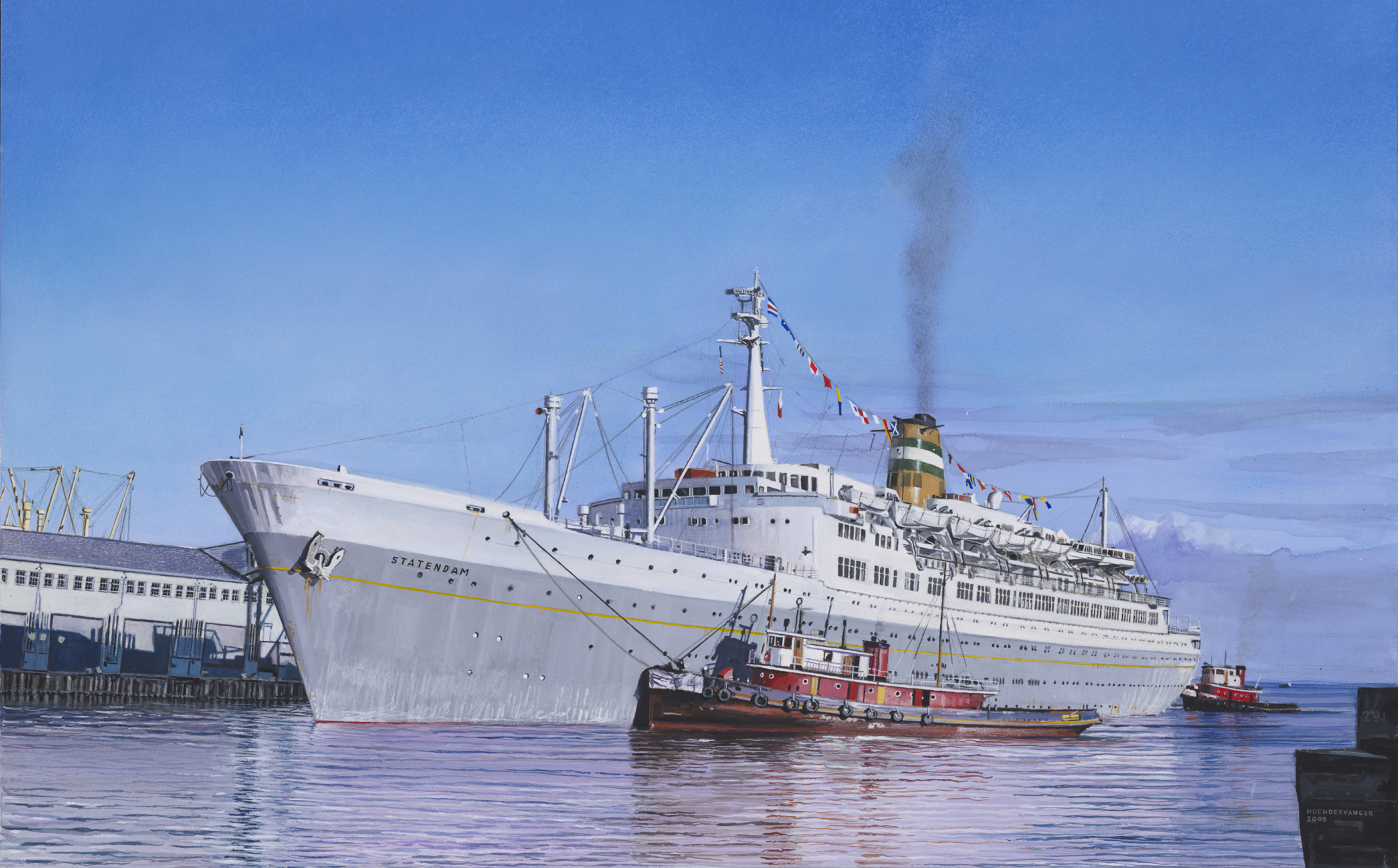 Op een zonovergoten ochtend meert de Statendam (1957) af aan Pier 35s in San Francisco. Het schip is bezig met een cruise langs de Amerikaanse westkust in de jaren zestig. Op de voorgrond zien we de Miki-Miki-sleepboot Sea Lark, van de zogenaamde Miki-klasse. Bijzonder aan deze slepers was de volledig houten romp. De Statendam had de 'pech' al vanaf de bouw te worden overschaduwd door het s.s.Rotterdam, het nieuwe en grote(re) vlaggenschip van de Holland America Line. Daardoor heeft ze niet de waardering gekregen die ze eigenlijk verdiend zou hebben. Tot op heden is er ook nog geen enkel boek verschenen over dit schip. De Statendam heeft in al haar bescheidenheid meegeholpen aan de belangrijke eerste stappen tot de transformatie van de Holland America Line tot een echte cruiserederij. © W.J.Hoendervanger