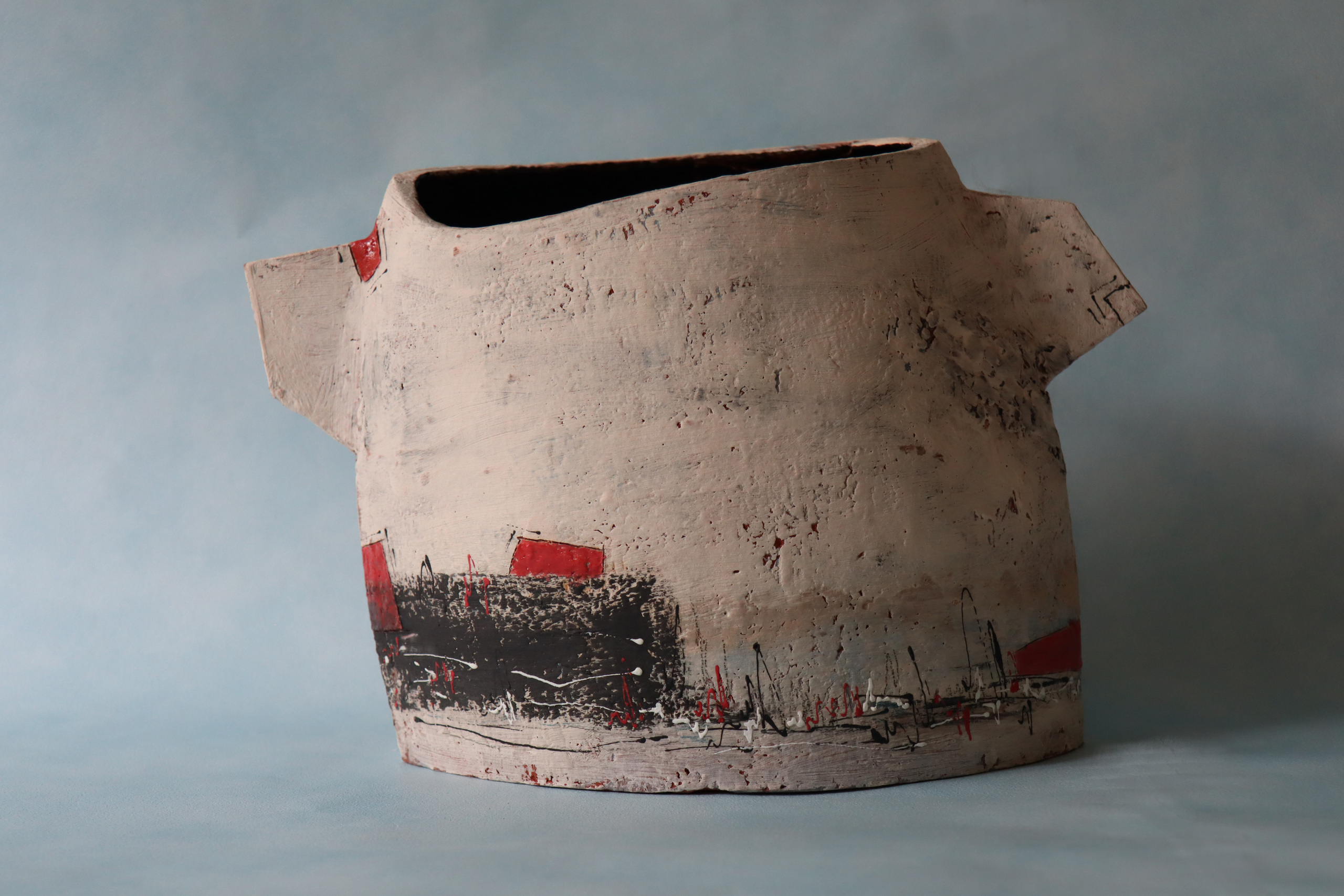 Deze pot is gemaakt van steengoedklei en opgebouwd met plakken. Gedecoreerd met ingekleurde kleislibs en glazuur. De binnenkant is gegalazuurd. Electrisch gestookt op 1150 gr.