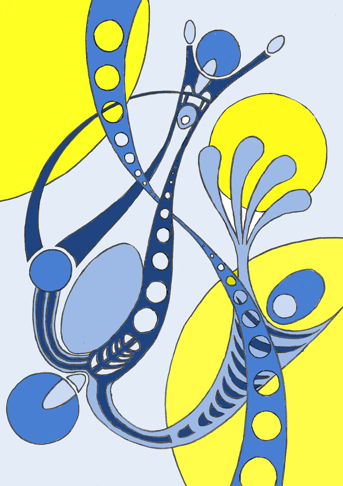De acryl schilderij 'vrije geesten' is een vervanging van een eerder door mij gemaakt conté schilderij uit 2008 die door werklieden per ongeluk vernield was. Het stelt geesten voor die zonder belemmering zich door tijd en ruimte verplaatsen, maar wel gekoppeld blijven aan andere geesten..