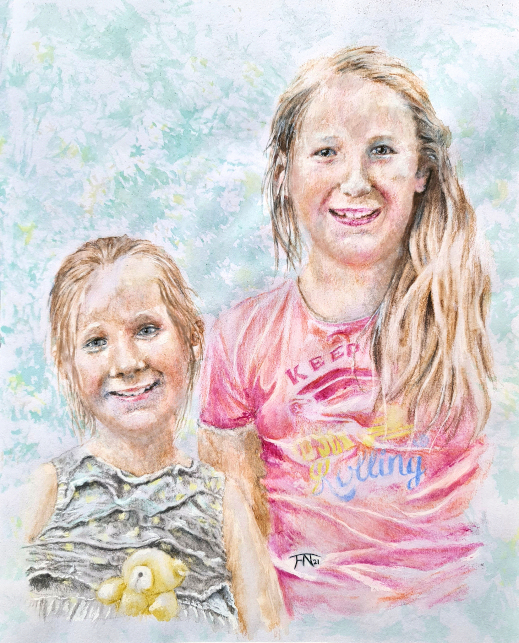 Ik heb mijn kleindochters Lina en Moira in het park gefotografeerd. Ik heb er daarna een aquarel schilderijtje van gemaakt.