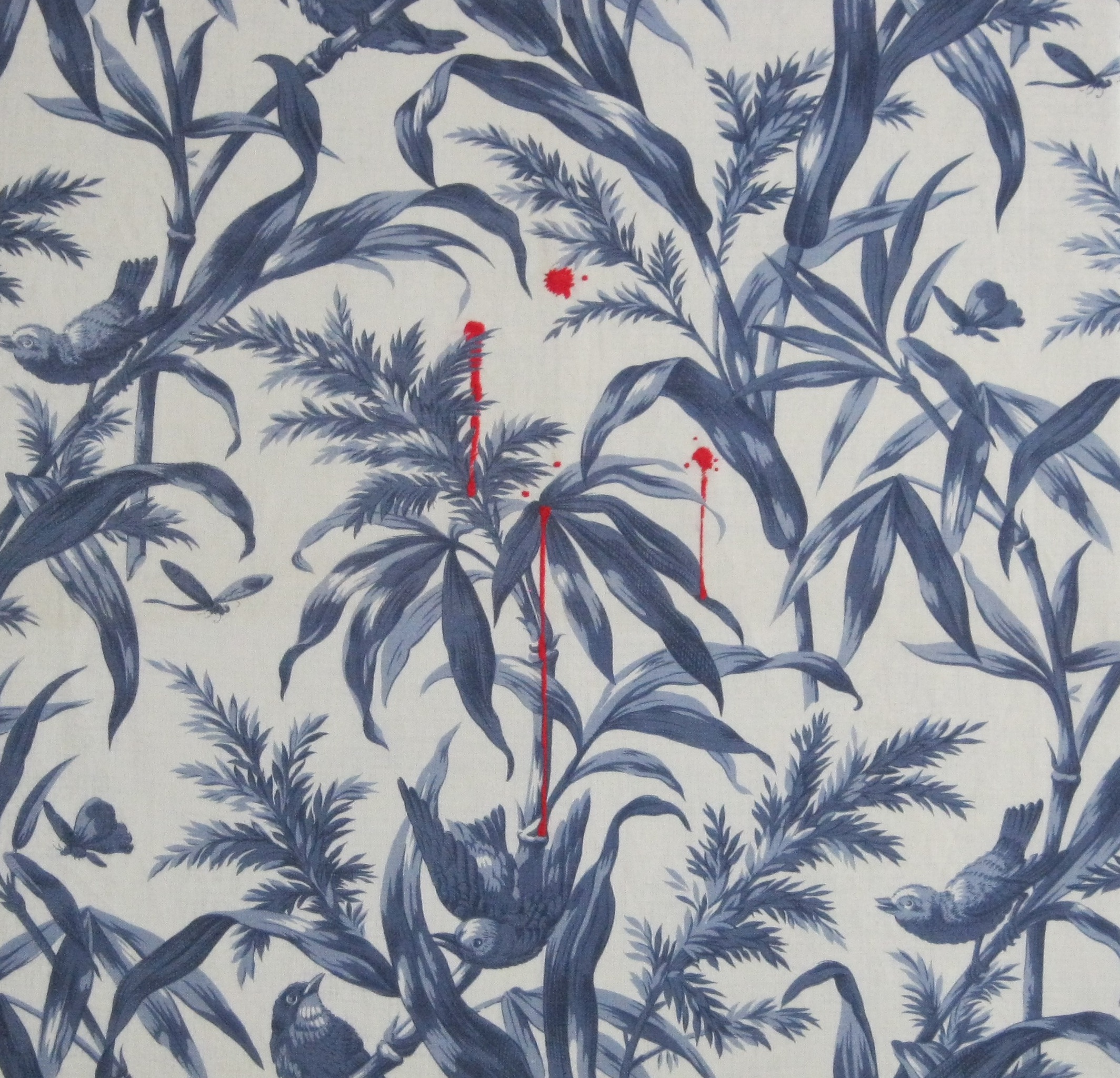Te zien geweest op de tentoonstelling "Shocking", AIAP Monaco, 2003. Borduursel op bedrukte interieurstof.