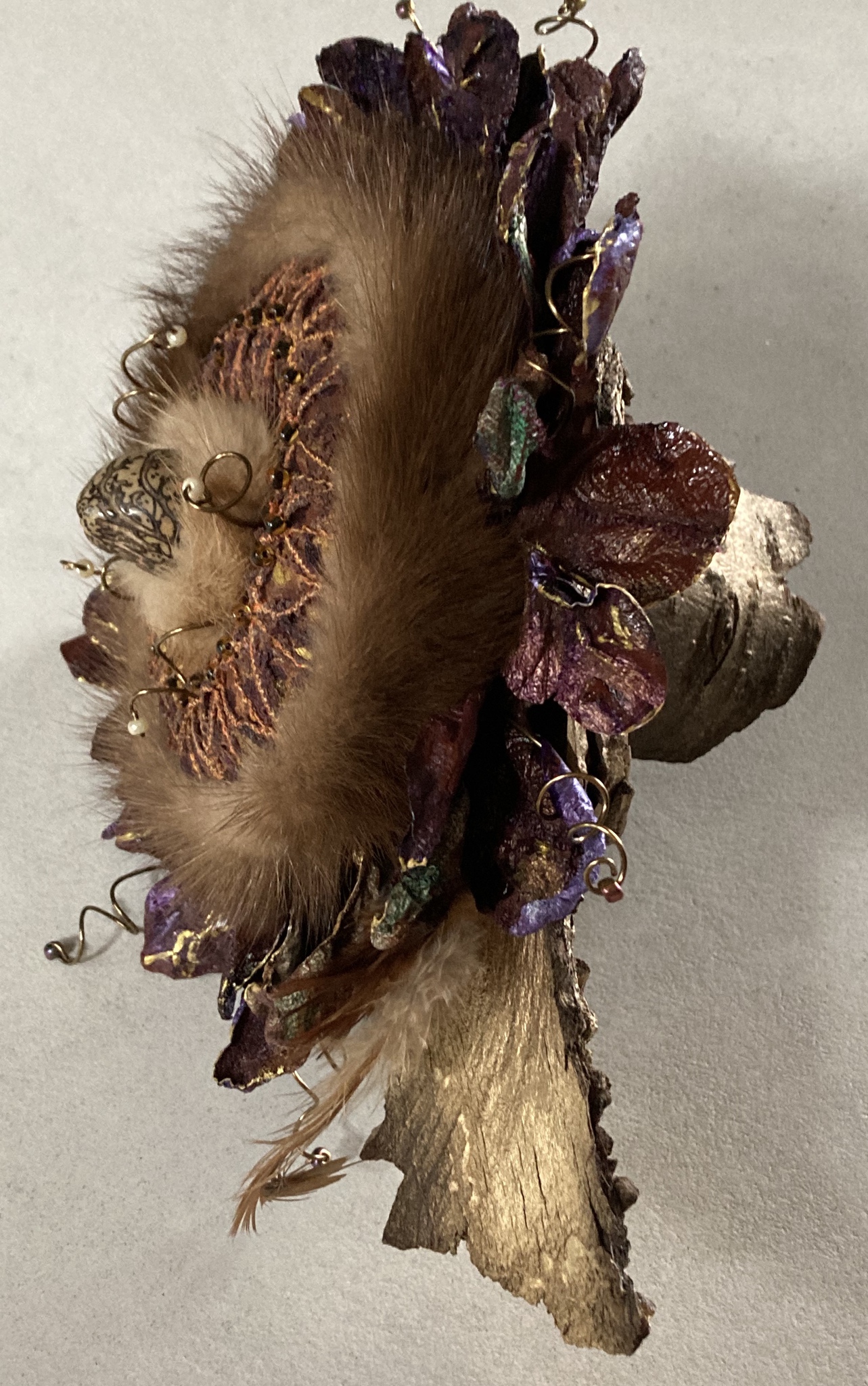 Kijken met andere ogen! Geïnspireerd door een verdroogde artisjok heb ik dit object bestaande uit een afgebroken tak schuimrubber /bont metaaldraad en kralen gemaakt.