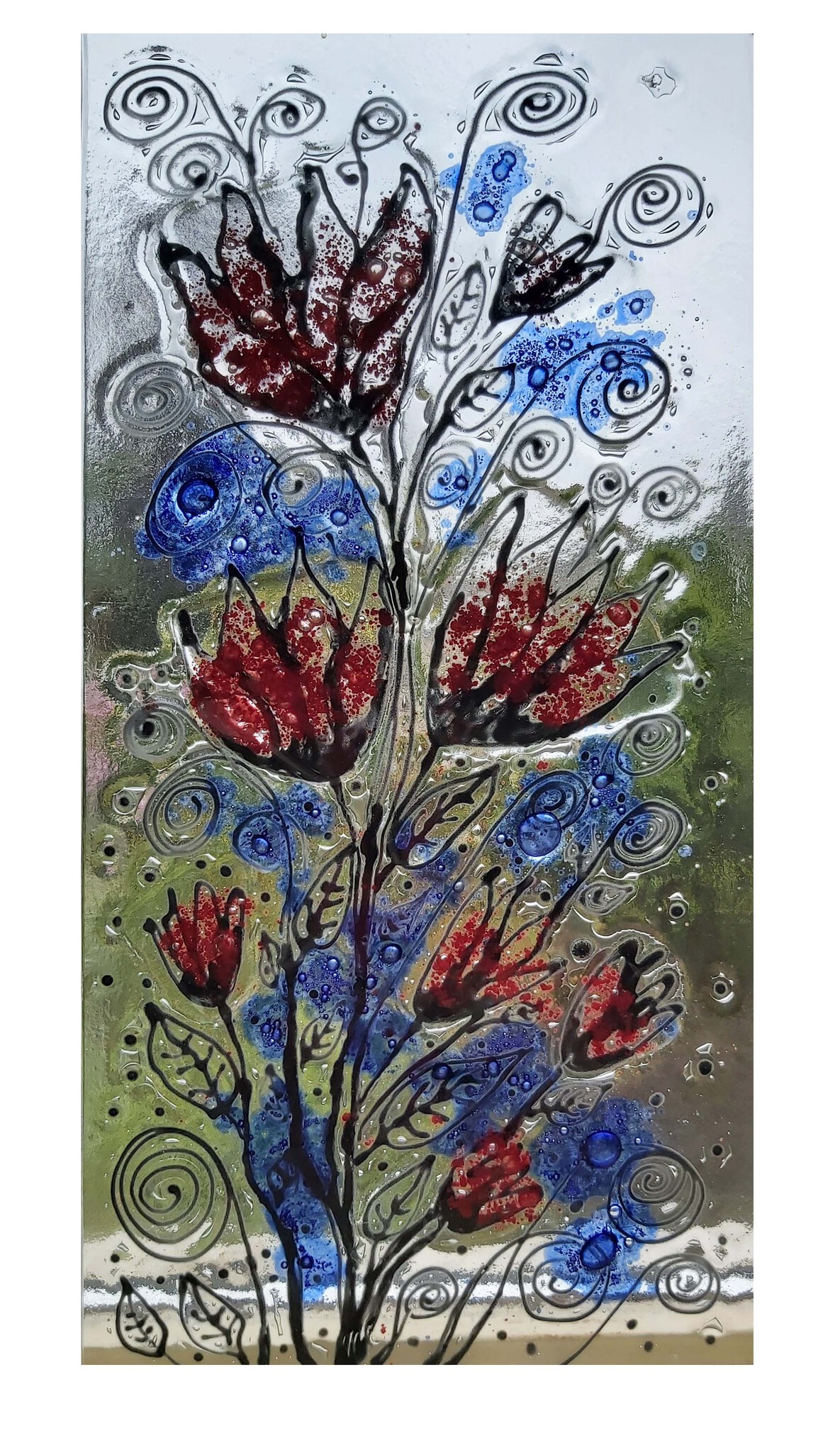 Fantasietekening met bloemen op gles Gecombineerde techniek, glasfusing en tekening op glas