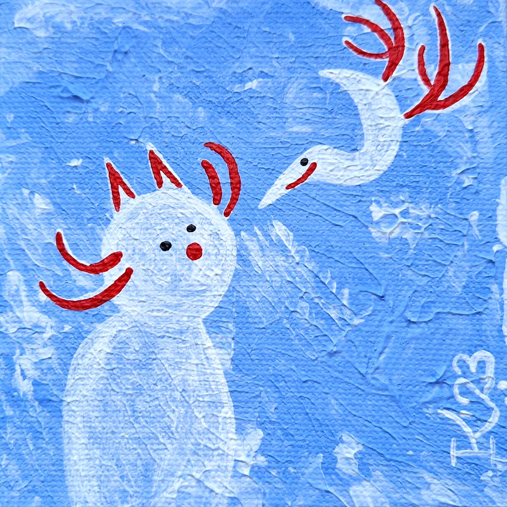 Acrylverf op katoen, 10 bij 10 cm, dit werkje kan opgehangen worden. De achtergrondkleur is in werkelijkheid lichter, dus voor aanschaf even beeldbellen is handig. Pictoright. Dit werk is tot en met eind december in de bibliotheek in Oegstgeest te zien en te koop. Lange Voort 21, naast de Hema. Ma. 14.00 tot 18.00 uur, di. t/m za 10.00-18.00 uur.