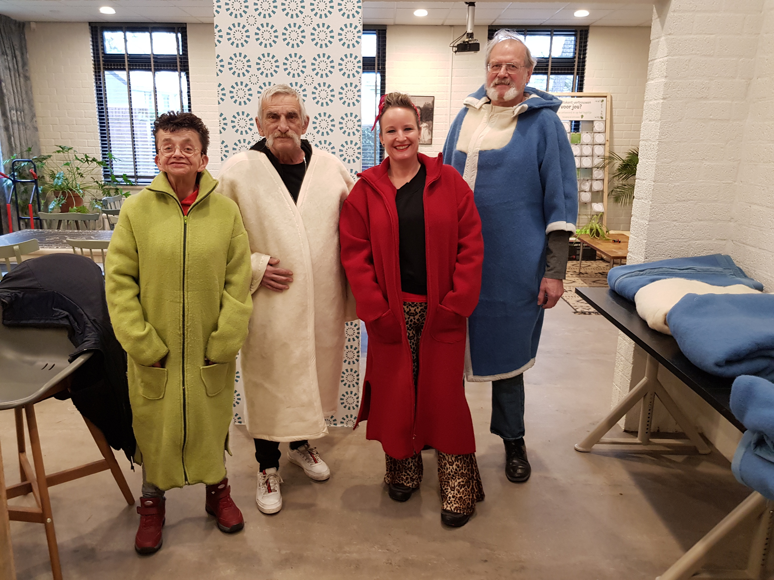 In januari was het een paar weken flink koud. Ik dacht: hoe zou het zijn om de hele dag in de kou te zitten en je hebt niet de mogelijkheid om op wat voor manier dan ook hier iets aan te doen. Omdat ik vanuit mijn ervaring als textielkunstenaar jassen ontwerp van duurzaam materiaal, voornamelijk wol en vilt, bedacht ik mij dat ik jassen zou kunnen maken voor diegenen die het hard nodig hebben. Ik heb contact opgenomen met een wollen deken fabrikant en uitgelegd wat mijn idee was. Van hem heb ik 10 x 100% zuiver scheerwollen dekens opgehaald en daar heb ik kimonojassen van gemaakt in een grote maat zodat zij geschikt zijn voor mannen en vrouwen. Heerlijke warmte voor op de bank en binnenshuis. De jassen heb ik gedoneerd aan de Quiet Community in Tilburg.