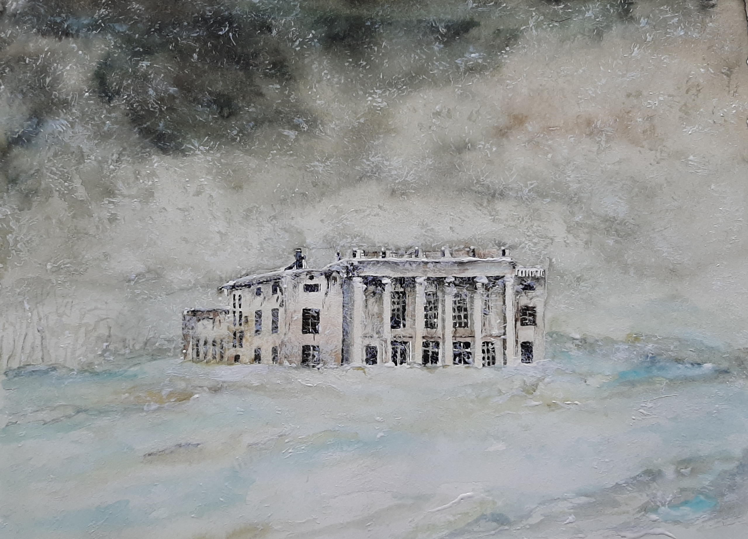 Geschilderd naar de foto van de Russische fotograaf Danila Tkatchenko. Het werk maakt deel uit van zijn reeks 'RESTRICTED AREAS'. Hijzelf zegt er het volgende over: The building on the photo shows the cultural center, one of the objects for bombing. Russia, Komi Republic, 2014. Tkachenko fotografeerde ze op voormalige militaire bases of locaties voor ruimtevaarttechnologie of nucleaire testen, onvindbaar op de kaart. Restricted Areas is in 2016 is ook als boek verschenen. Reizend door de voormalige Sovjet-Unie fotografeerde Tkachenko artefacten uit een ander tijdperk - verlaten en vervallen, bevroren in ijs en in de tijd. "De sites van vergeten wetenschappelijke triomfen, verlaten gebouwen van bijna onmenselijke complexiteit. De perfecte technocratische toekomst die nooit kwam." Bij het fotograferen van deze vervallen sites wijst Tkachenko op de zinloosheid van ons verlangen naar constante vooruitgang.