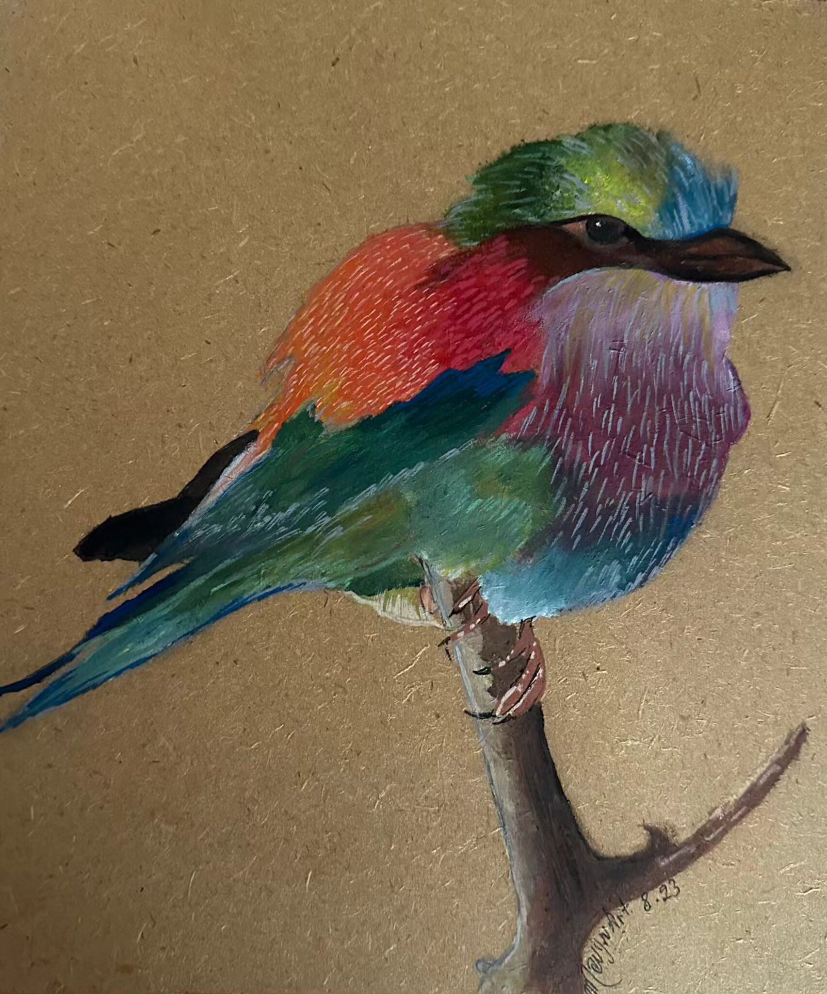 Een lief klien vogeltje, maar niet om te aaien. Acryl op MDF.