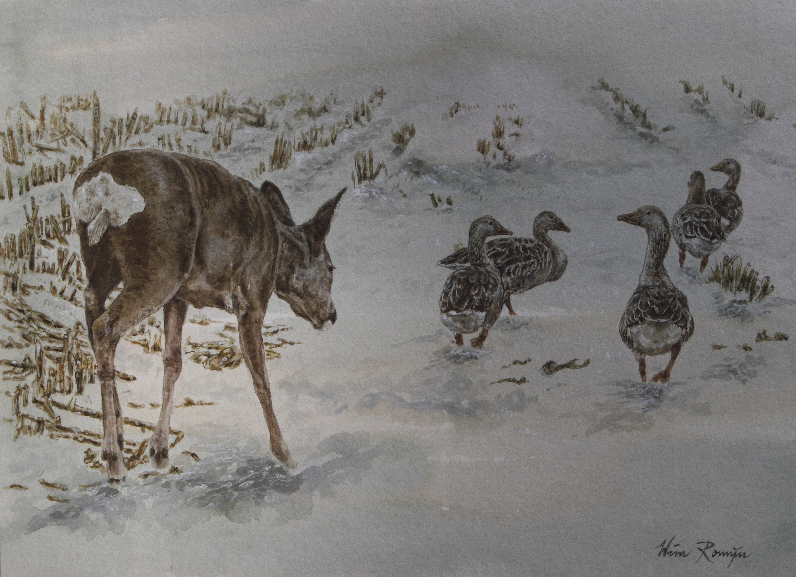 Op zoek naar overblijfselen van maiskolven beweegt een reegeit zich tussen Grauwe ganzen. Wees gerust, ze komt in vrede. Van overheidswege moeten akkers na de oogst van mais, koren, bieten, koolzaad en aardappelen worden geploegd en direct ingezaaid (met een groenbemester). Dit komt over als het vernietigen van voedsel voor reeën, ganzen, zwanen, eenden en hazen. Ook het bodemleven heeft baat bij het laten liggen van oogstresten. Om deze reden wordt bouwland (zolang het nog niet is bewerkt) ook door weidevogels bezocht op zoek naar pieren, slakken en andere bodemfauna. Nu strijken ganzen neer op een akker met opkomende wintergerst terwijl op een belendend perceel de wortels van de halmen (stoppels) en achtergebleven maiskorrels grotendeels zijn ondergeploegd.