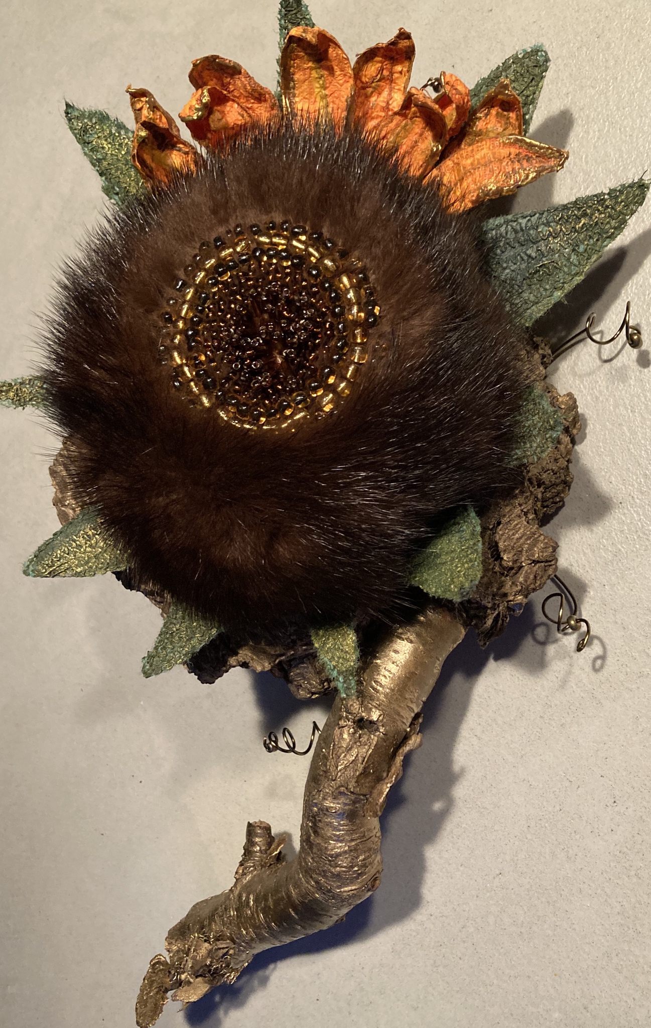 Dit werk is opgebouwd met een gevonden tak en schors, de tak en schors krijgen een nieuw uiterlijk en zo een tweede leven. Gebruikte materialen: Bont, wol, glaskralen, tyvek, metaaldraad. Gebruikte technieken: beschilderen/bespuiten, borduren zowel met de hand als machinaal